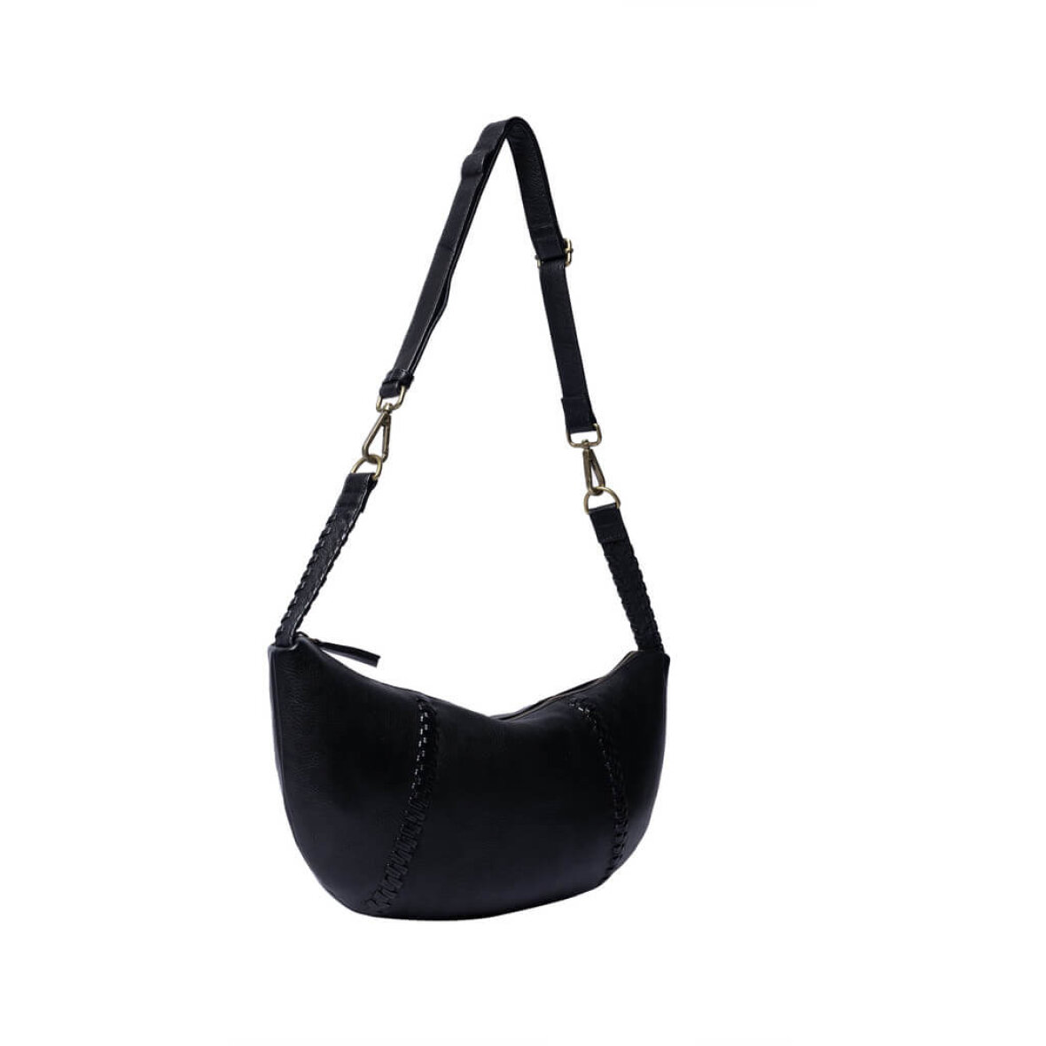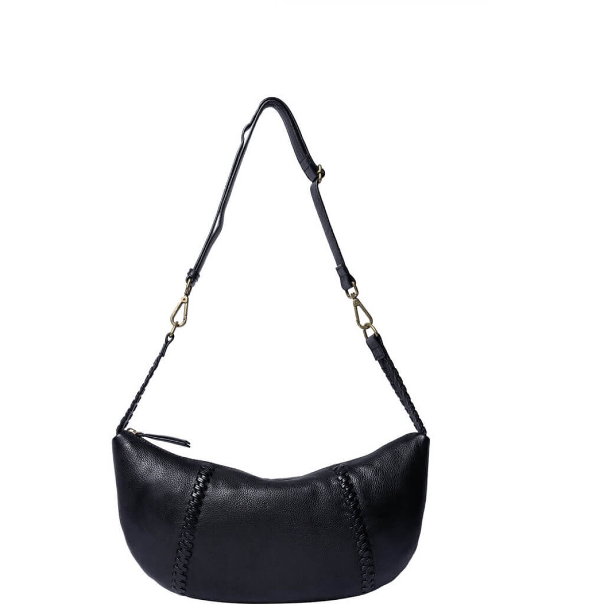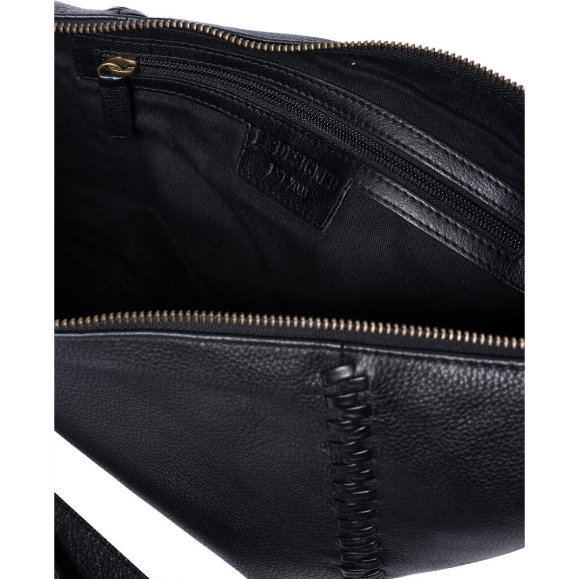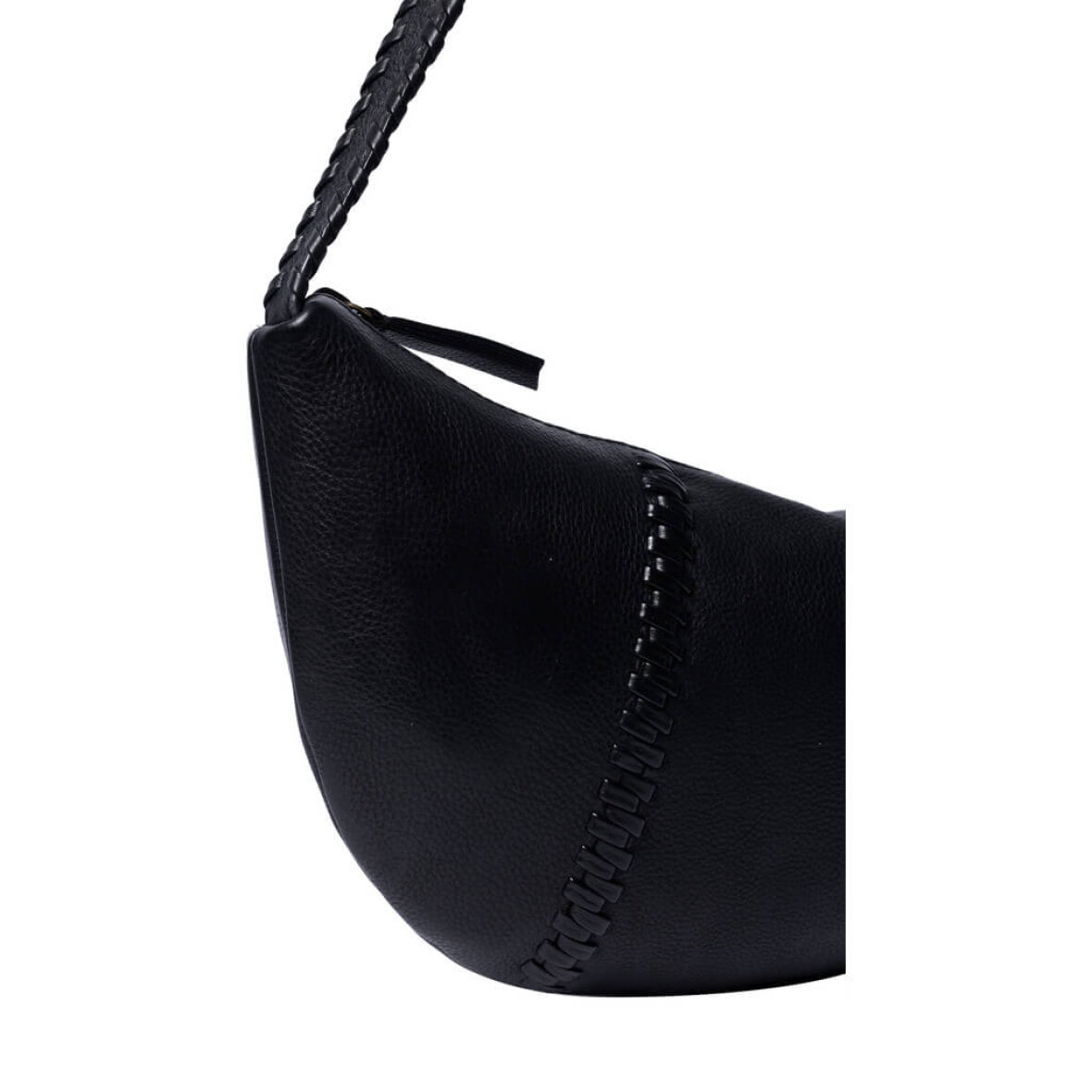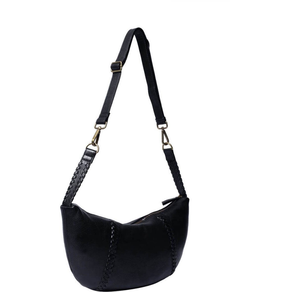 Den sorte taske er håndlavet og har en unik rem med flettede detaljer, så du kan tilpasse den efter din stil og komfort. Tasken lukkes med lynlås og har et hovedrum med en indvendig lynlås lomme med plads til de vigtigste småting. En praktisk taske med et trendy udtryk.