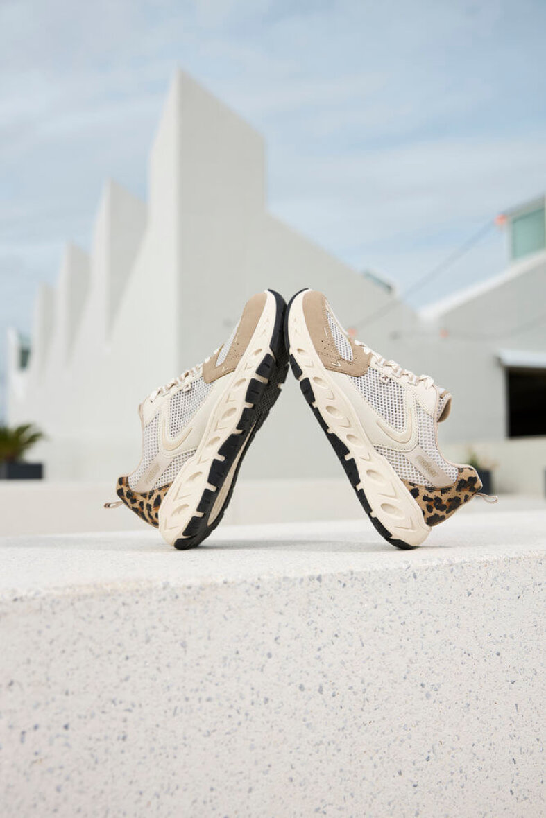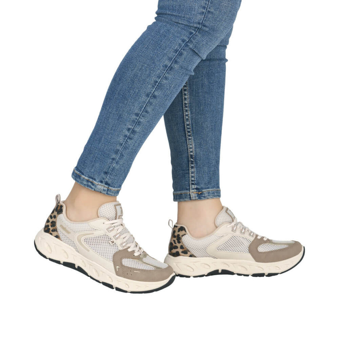 Rieker snakers i et stilfuldt og sporty look i en flot lys beige farve med leopard print detaljer. Den lette sneaker er lavet i et åndbart netmateriale af tekstil, der holder fødderne friske hele dagen.