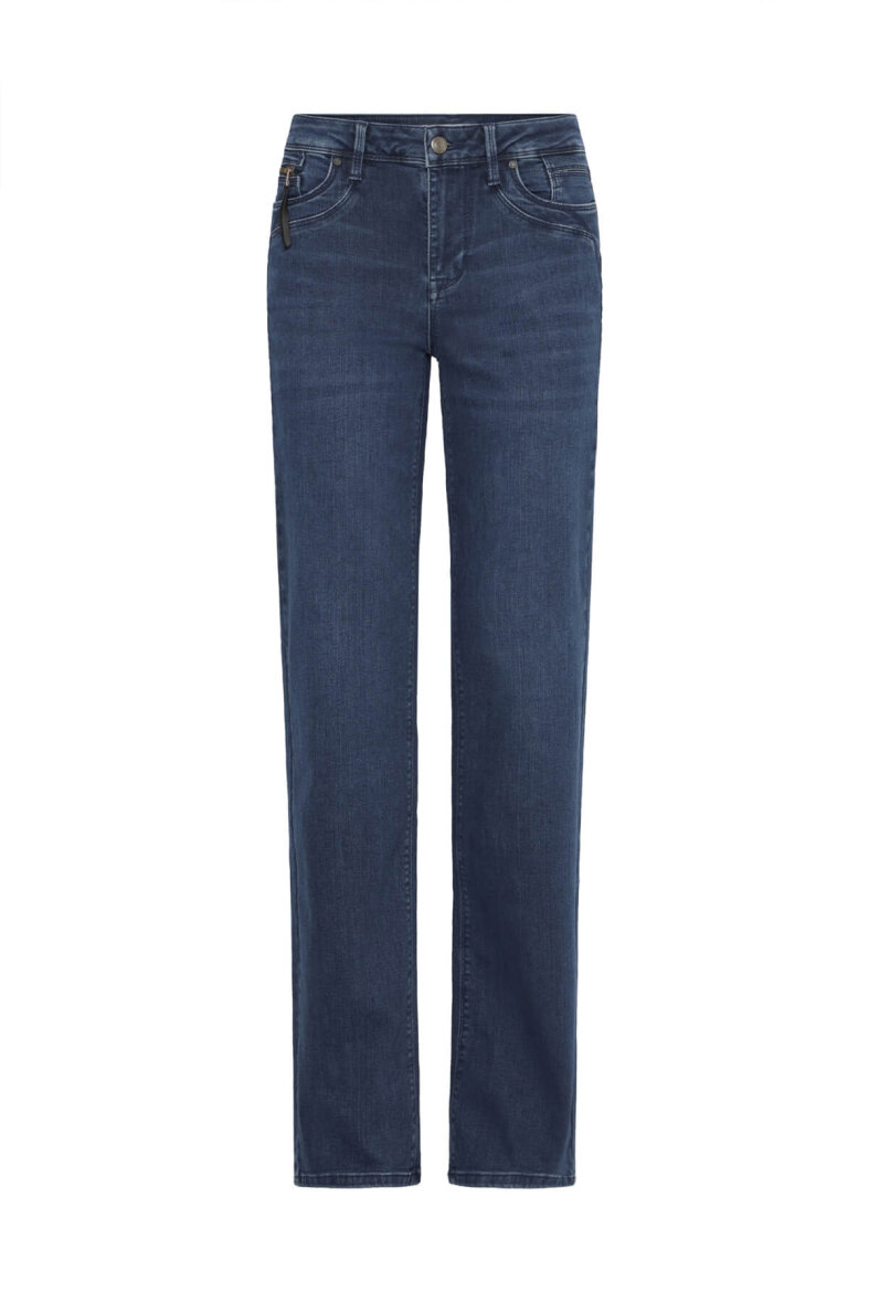 Karoline buksen er med knapluk, lyslås og bæltestropper. Buksen er med en flot mørkeblå broderingsstribe i begge sider, som giver lidt kant til designet. Buksen er med baglommer og forlommer med lynlåslomme med brun rem i den ene side og stiklomme i den anden side.