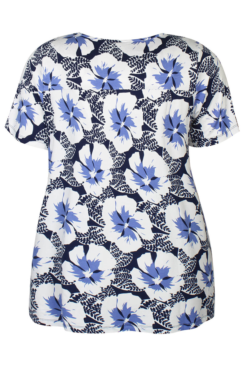 Zhenzi t-shirt i hvid med et flot og feminint blomstret mønster i blå nuancer. T-shirten er med rund hals med rynke detalje, som skaber et flot spil i stoffet og korte ærmer.