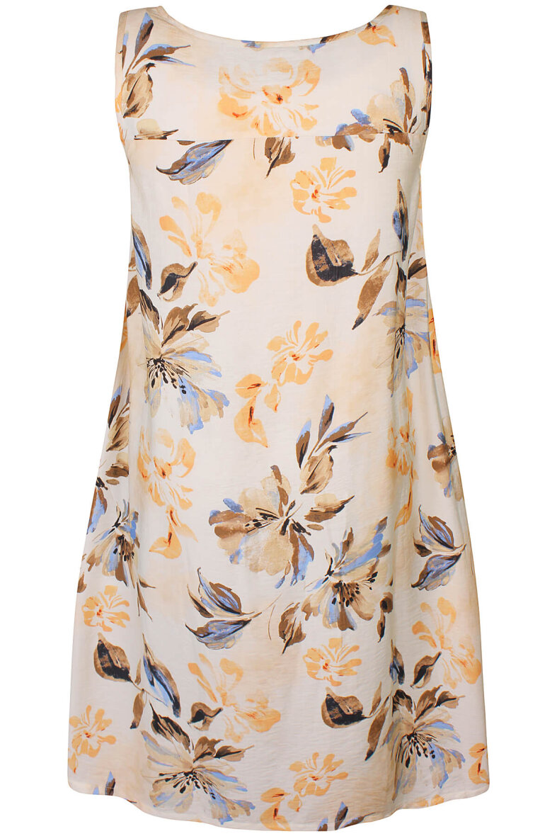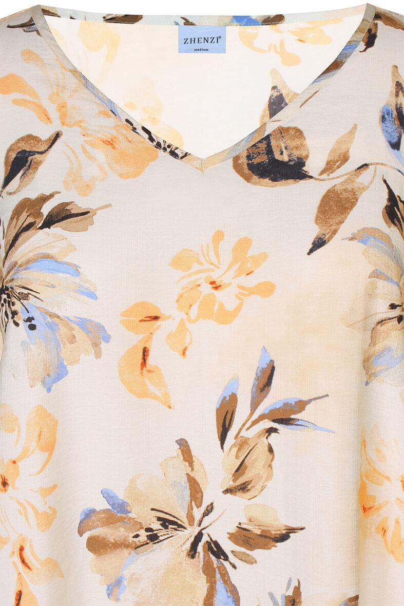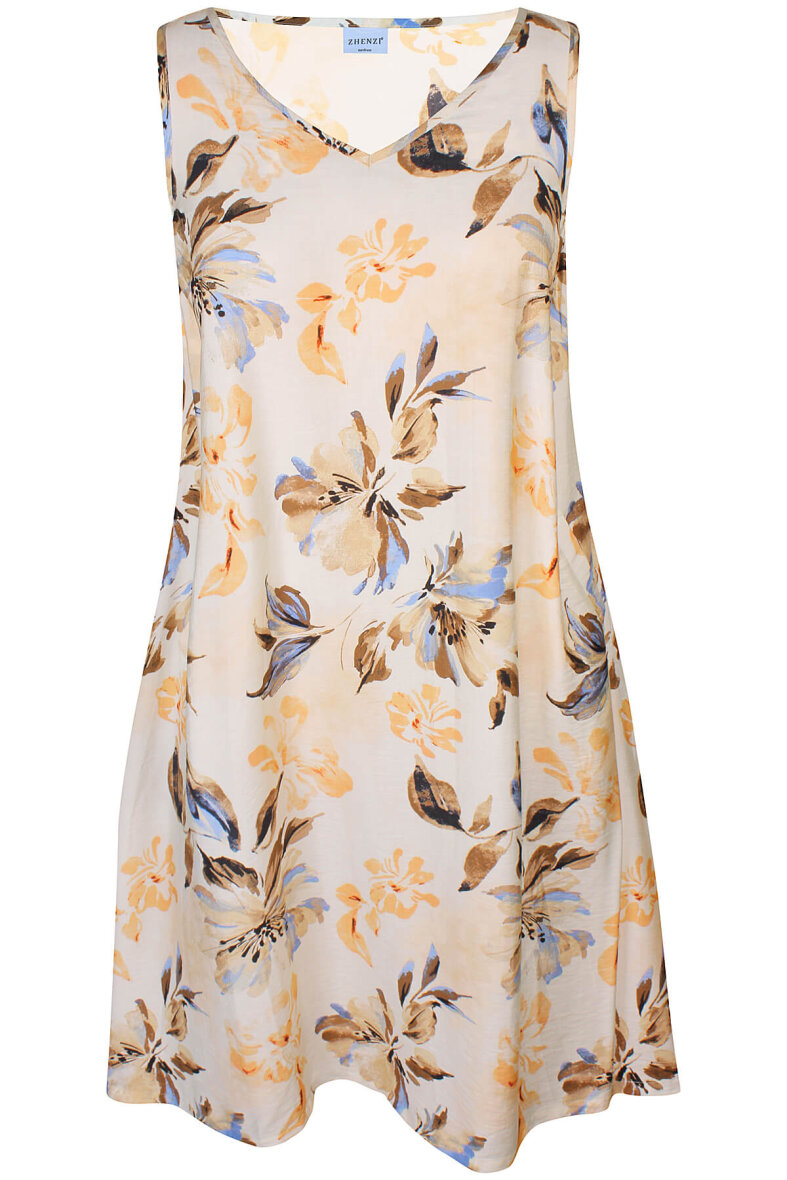 Zhenzi kjole i en flot lys farve med et fint blomstret print i orange, brune og blå toner. Et smukt og sommerligt print til de varmere måneder.
