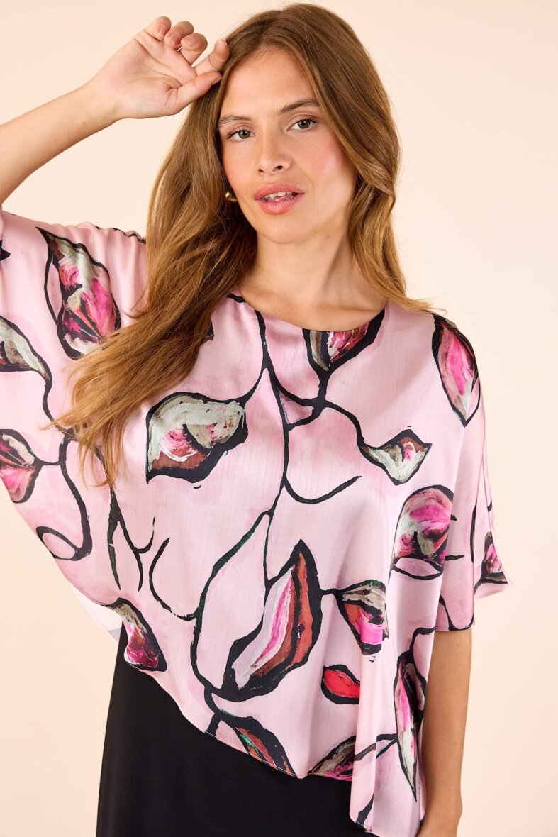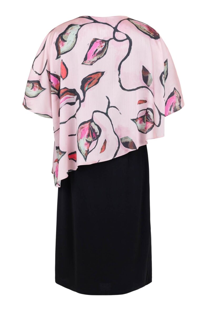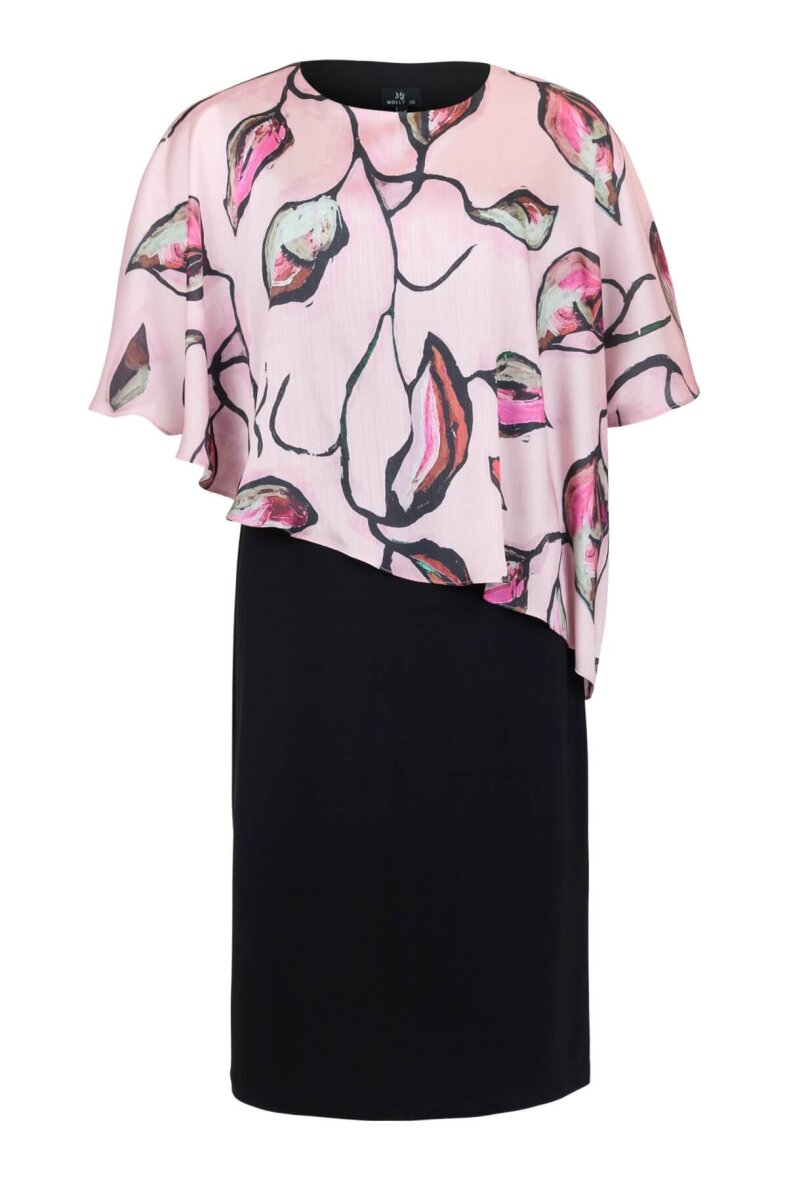 Kjolen er lavet i en sort underkjole i en flatterende pasform og brede stopper. Kjolen er med et smukt påsyet polyester overlag i et fint grafisk blomsterprint i rosa og lilla nuancer. Det lette stof med korte ærmer giver et feminint og sofistikeret udtryk