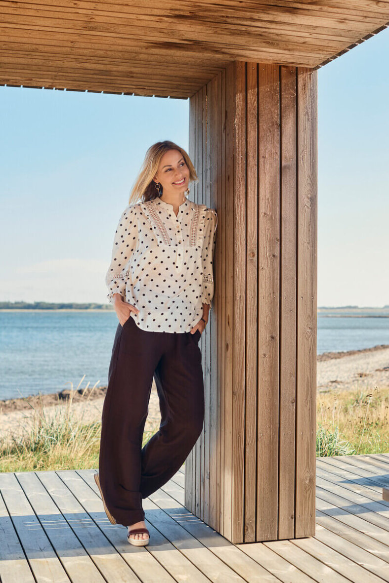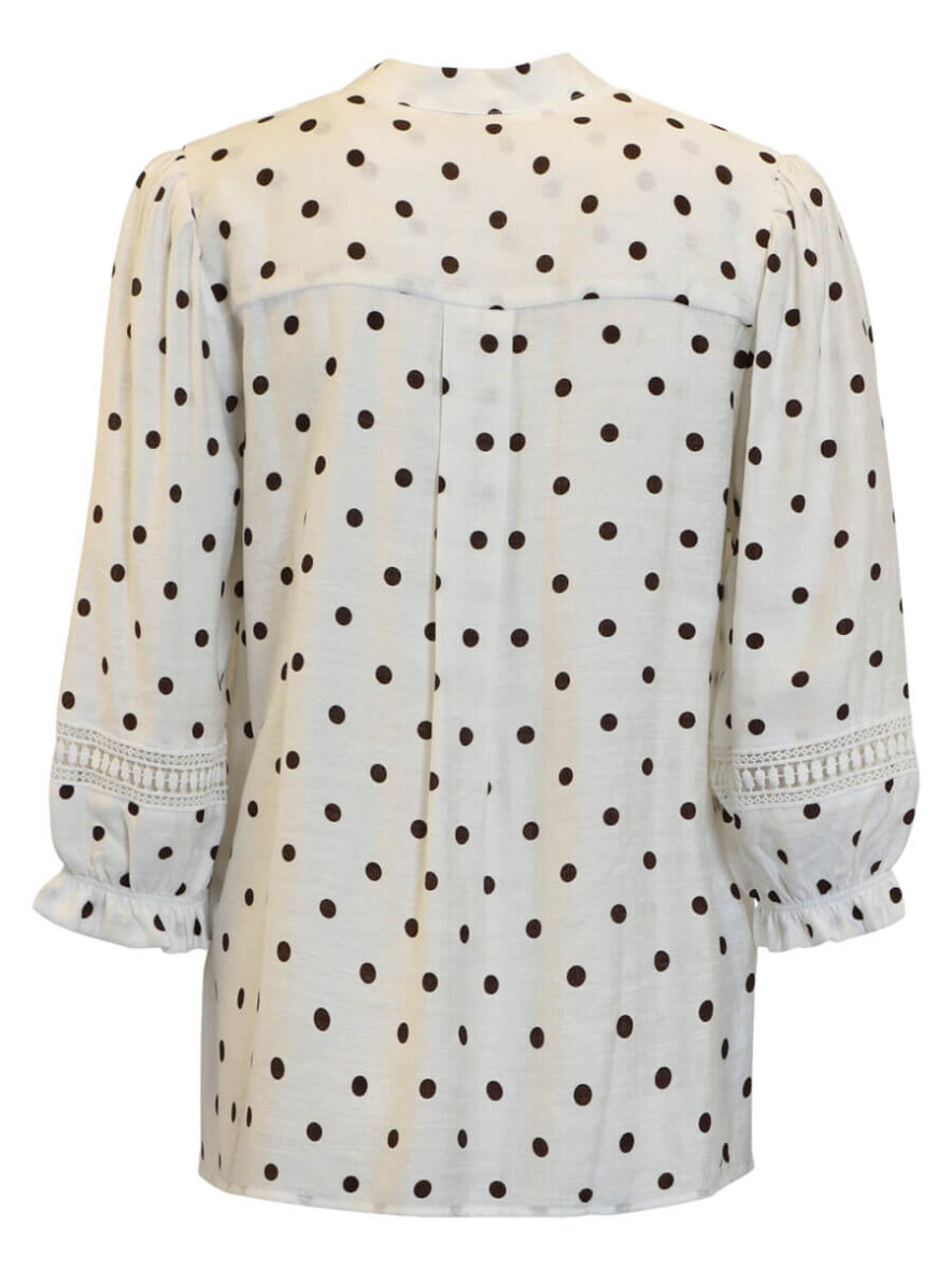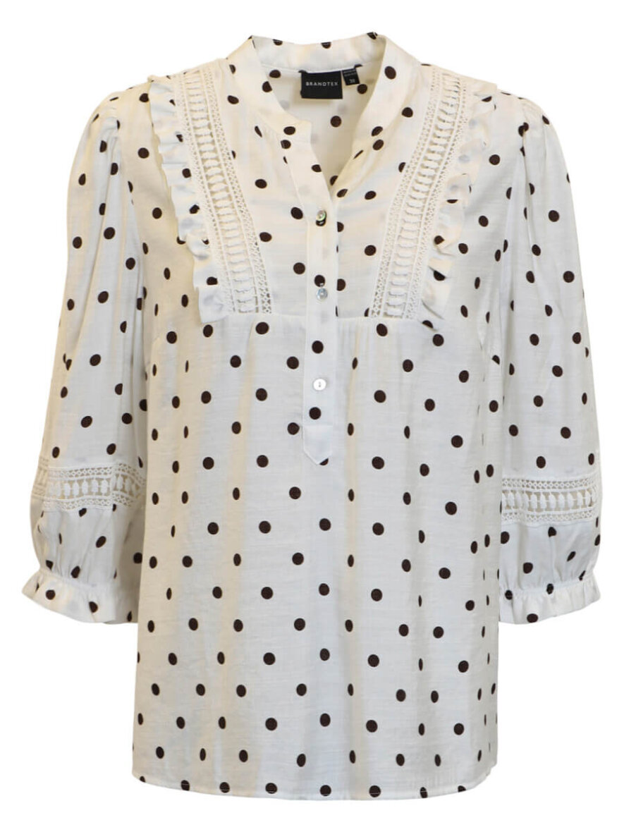 Brandtex bluse i en flot hvid farve med et moderne brun prikket mønster all-over.