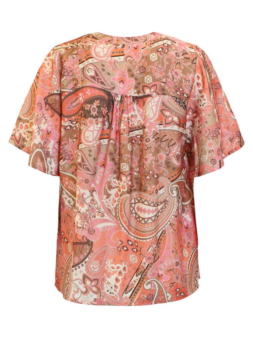 Brandtex bluse i et smukt print i et mix af rosa nuancer. Blusen er med v-halsudskæring som fortsætter i gennemgående knapluk langs fronten. Blusen er med en fin flæse detalje foran.