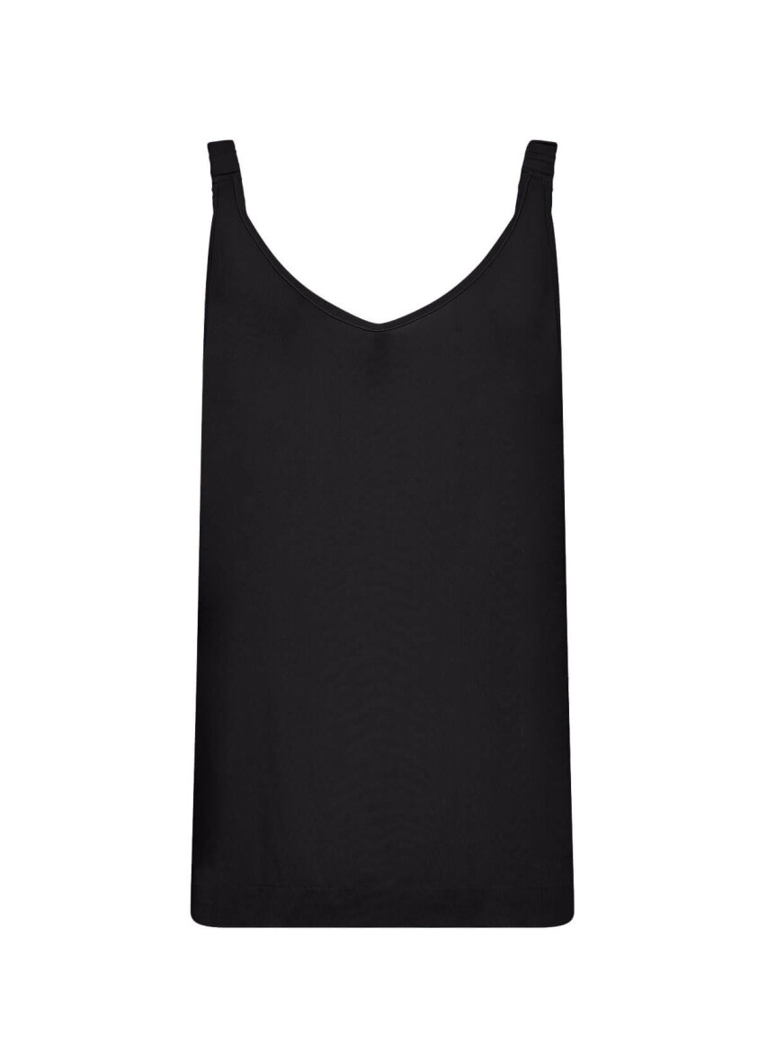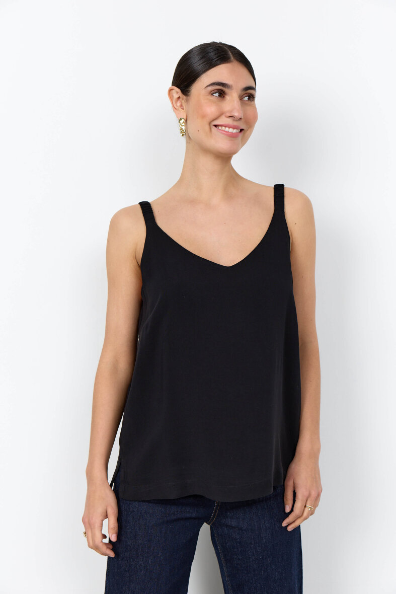 Toppen er med rund hals og stropper med elastik. Toppen er lavet i en let viskosekvalitet med to lags stof på forsiden. Med slids i siden.