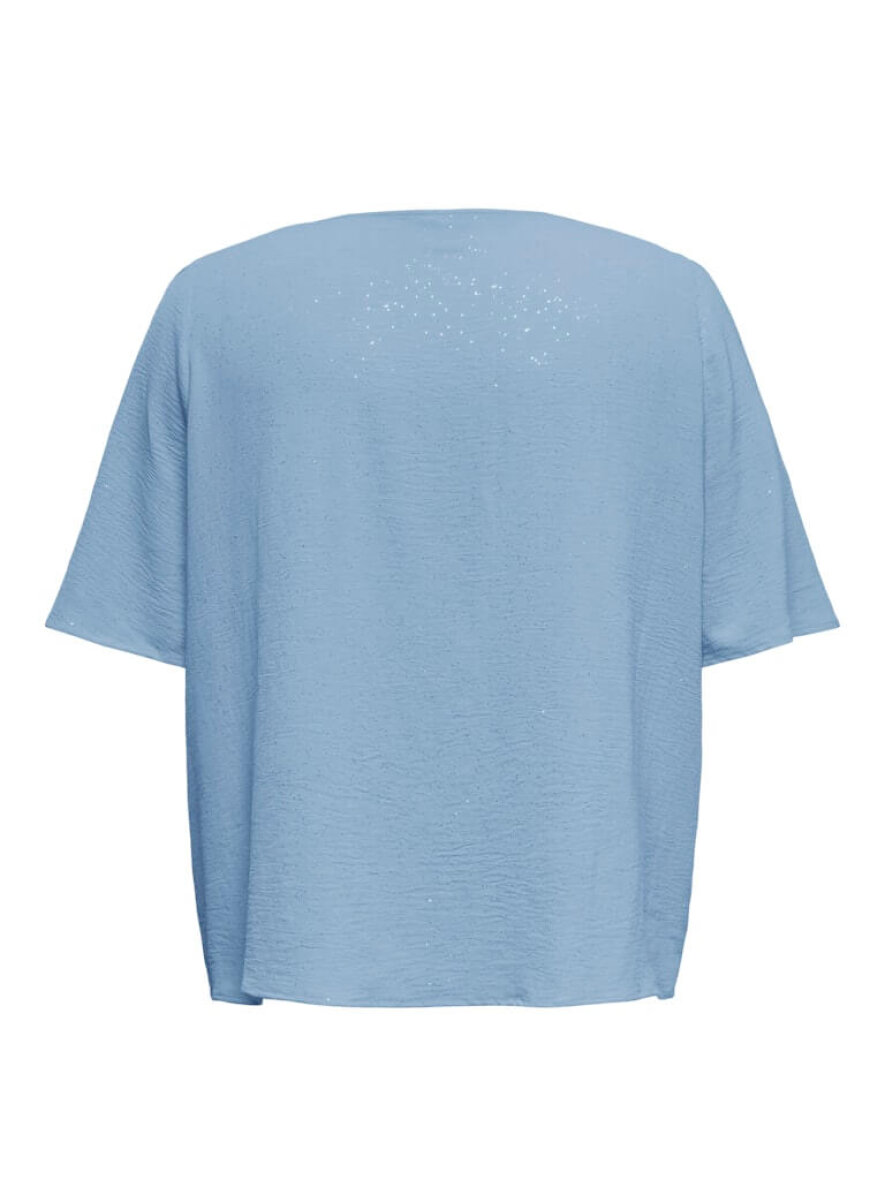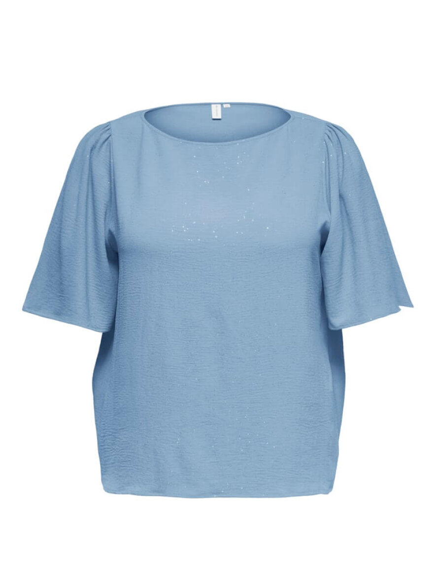 Only Carmakoma bluse i en flot pastel blå farve. Blusen er lavet i en behagelig polyester kvalitet med let struktur i stoffet, samtidig med at det smukke sølvglimmer all-over tilføjer et feminint touch til designet.