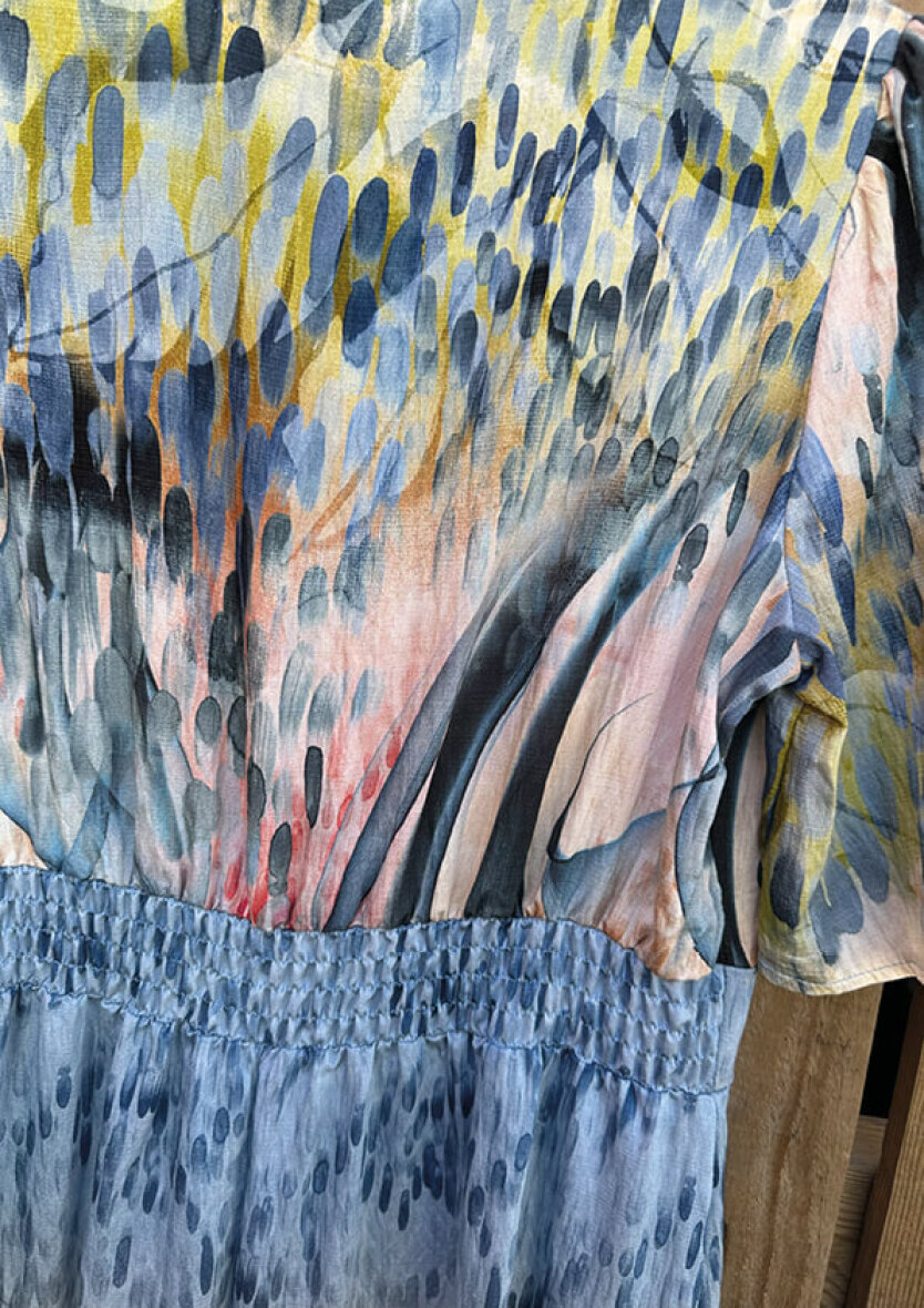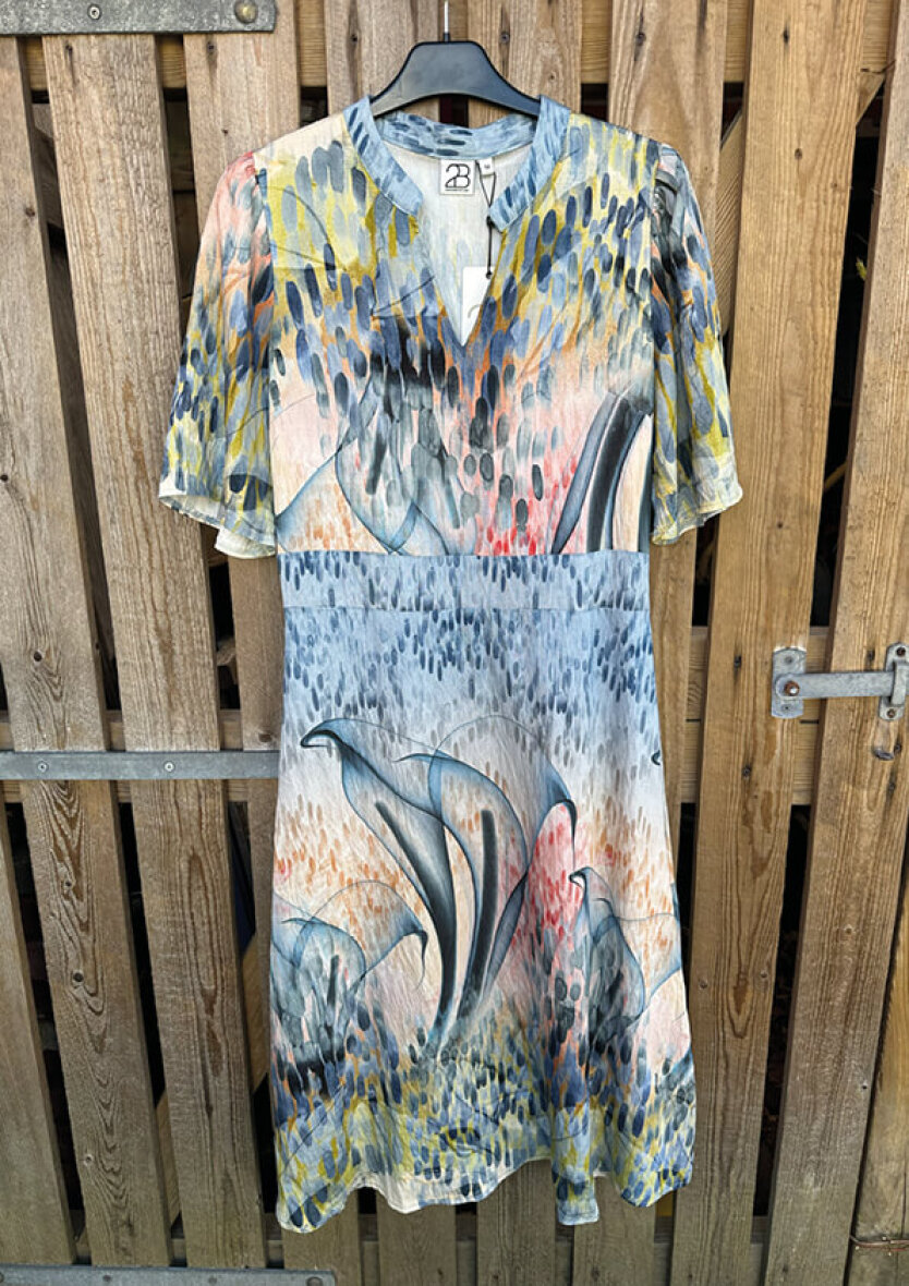 2-Biz kjole i modellen JAMPO er et stilfuldt valg til dig, der elsker prints. Kjolen er med lavet i en smuk farvekombination med blå som primær basefarve med elementer af rosa, grøn og brun.