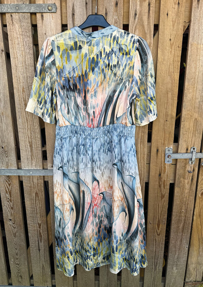 Kjolen er med v-halsudskæring med korte ærmer. En flot detalje er overskæringen i taljen med elastikstykke bagpå, hvilket skaber en flot og feminin facon når man bærer kjolen.