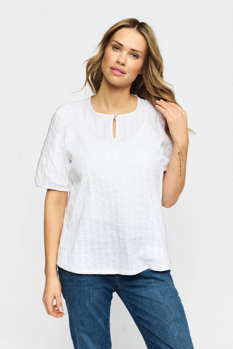 2-biz bluse i modellen OLLY er en flot og enkel hvid bluse. Blusen er med et charmerende syningsmønster i lodrette linjer, som skaber et feminint touch til det simple design.
