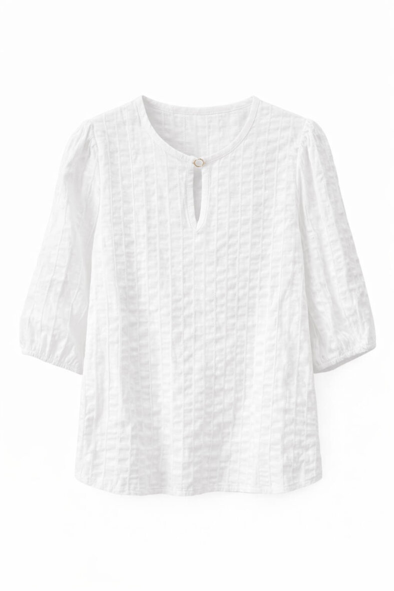 Blusen er med rund hals med knapluk og nøglehuls detalje. De korte ærmer er med puf effekt og afsluttes med elastikkant.