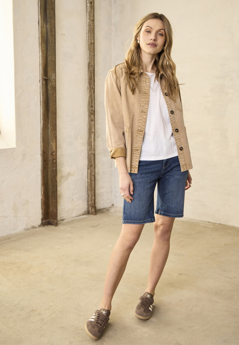 De højtaljet denim shorts lavet i et klassisk jeans design med knap- og lynlåsluk foran, bælte stropper og 5-lommer. En fin detalje er det lille ombuk nederst.
