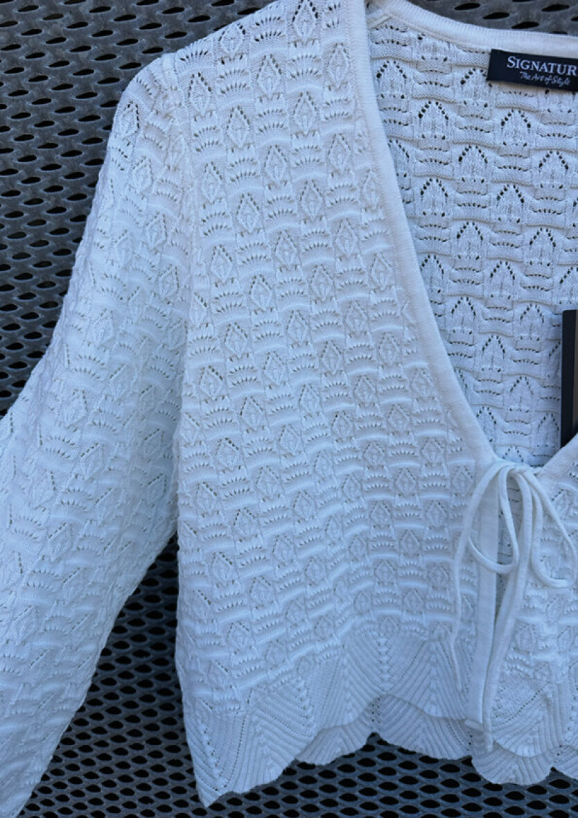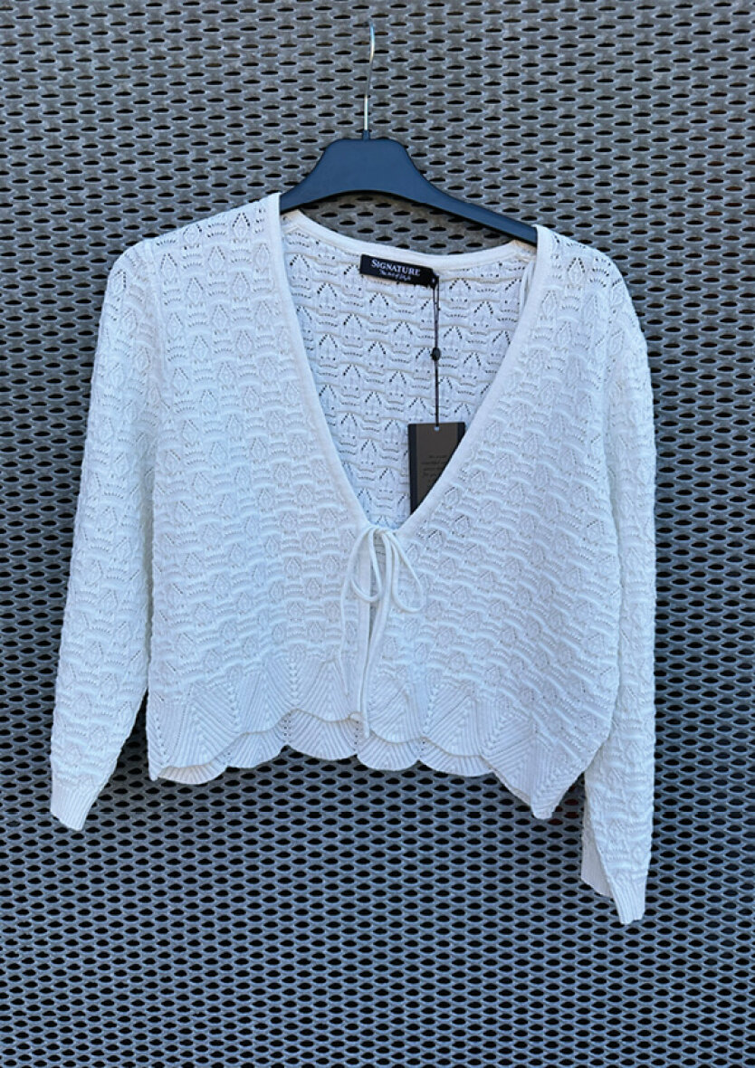 Signature bolero i off white og et fint hullet mønster. Boleroen er lukkes med snøre foran, hvilket gør den nem at style over både kjoler, bluser og skjorter, for at skabe et sødt look.