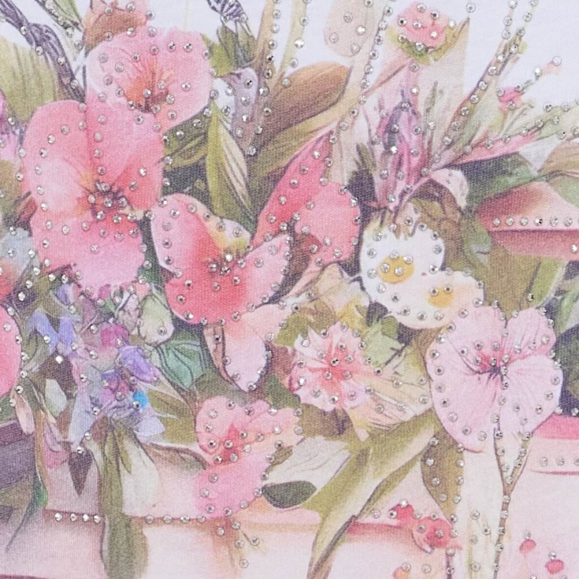 T-shirtens tryk viser en lyserød bus med lyserøde, hvide og grønne blomster, som er flot dekoreret med similisten, hvilket giver bling effekt og struktur på T-shirten.