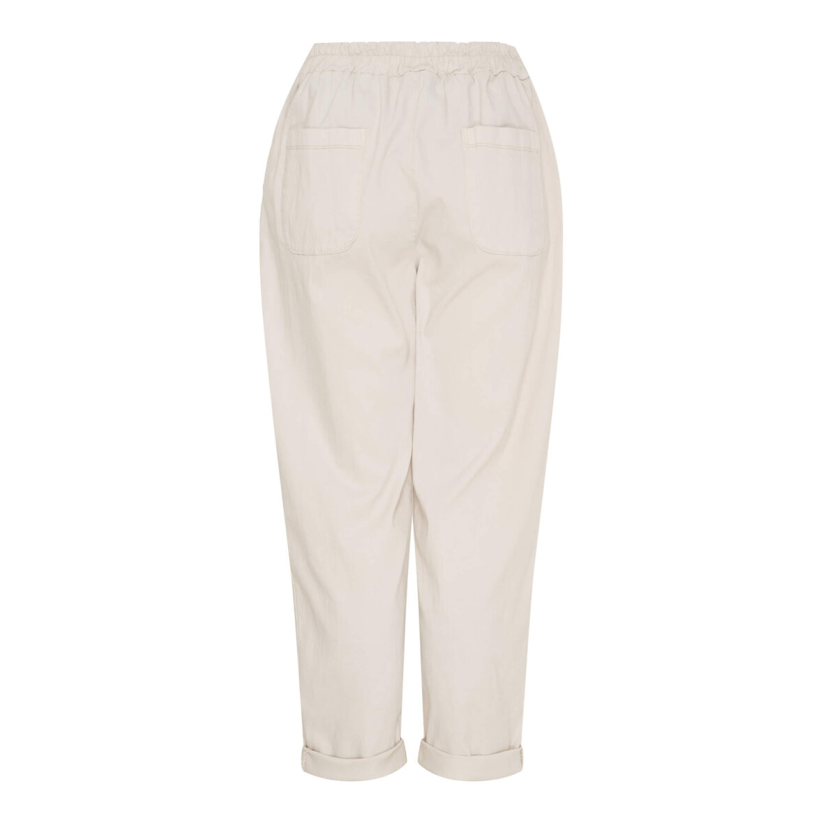 De lyse bukser er lavet i en kort stump pasform med opsmøg. Lavet i et løst afslappet fit med brede bukseben som indsnævres ved anklerne.