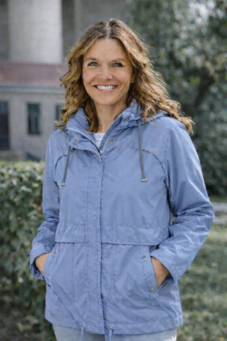Windfield damejakke i modellen Grace i en flot støvet blå farve. Jakken er fremstillet i et let, varmt og åndbart polyester materiale, som sikrer høj komfort hele dagen.