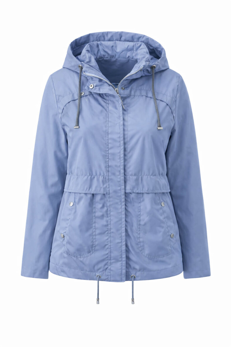 Jakken lukkes med lynlås foran og er med praktiske tryklommer. Jakken kan ombukkes og lukkes med trykknap. Den aftagelige hætte kan justeres med snøre, og de praktiske lommer gør det nemt at have dine vigtigste ting lige ved hånden.