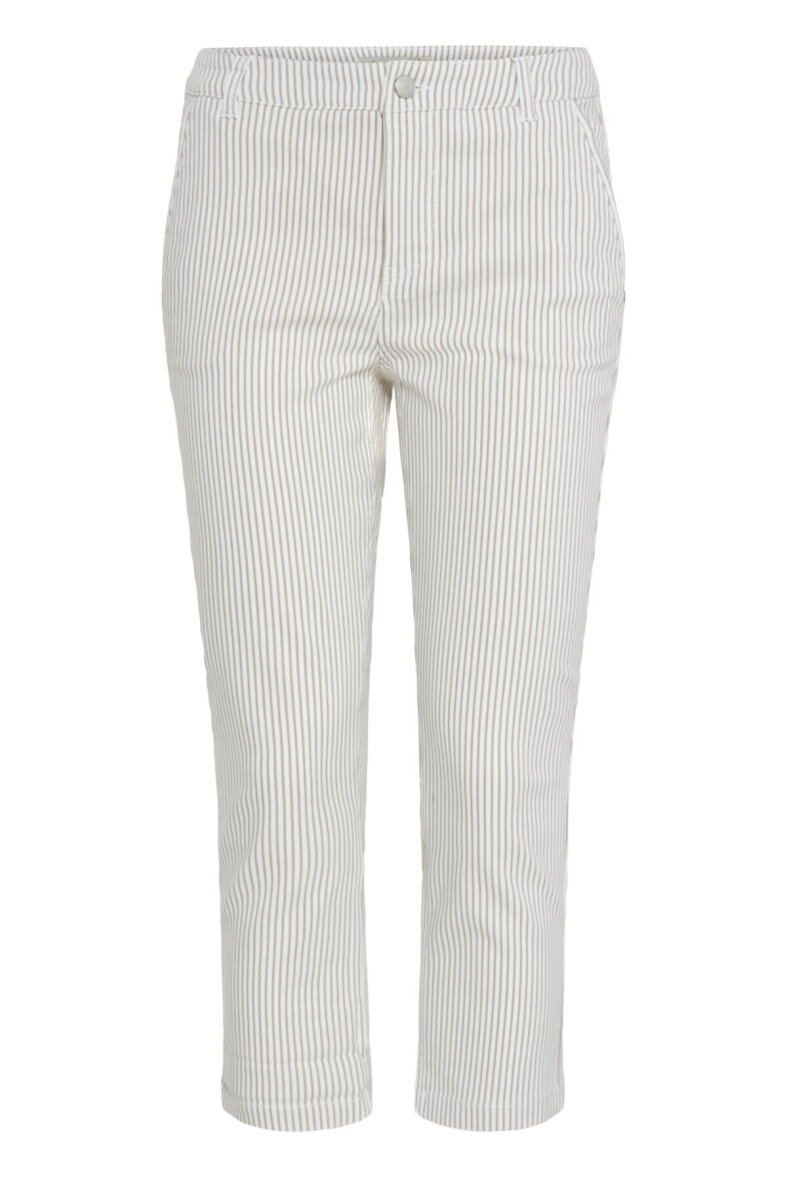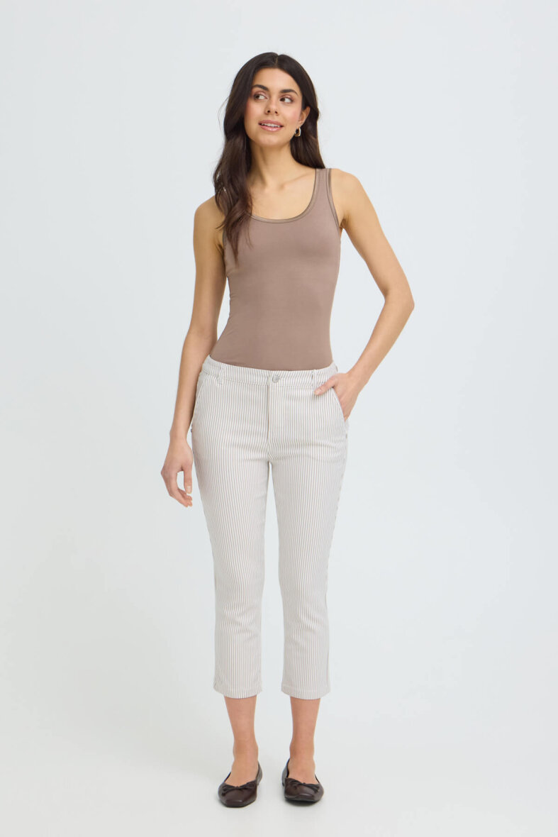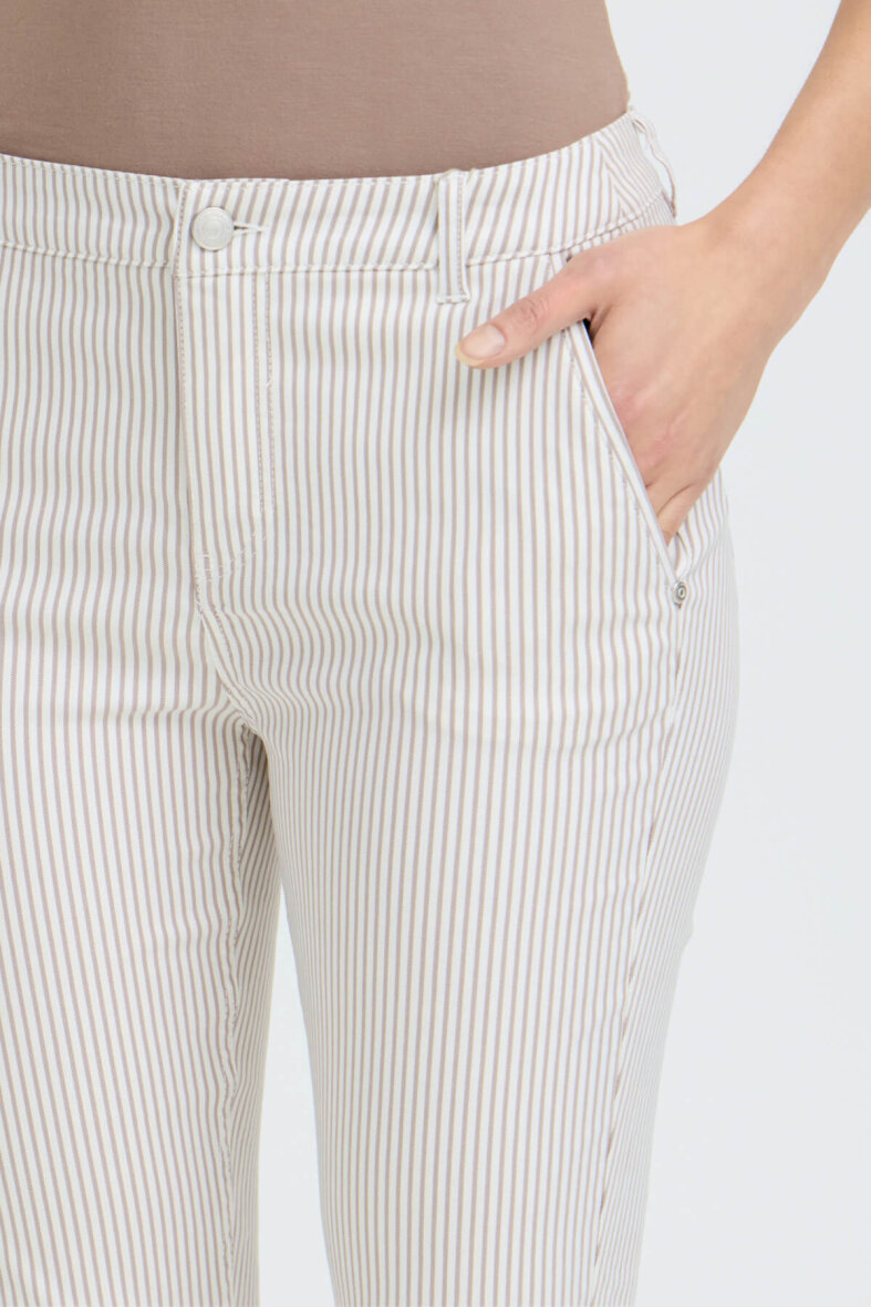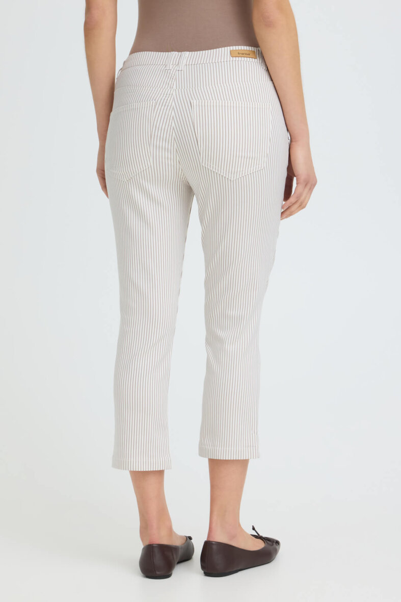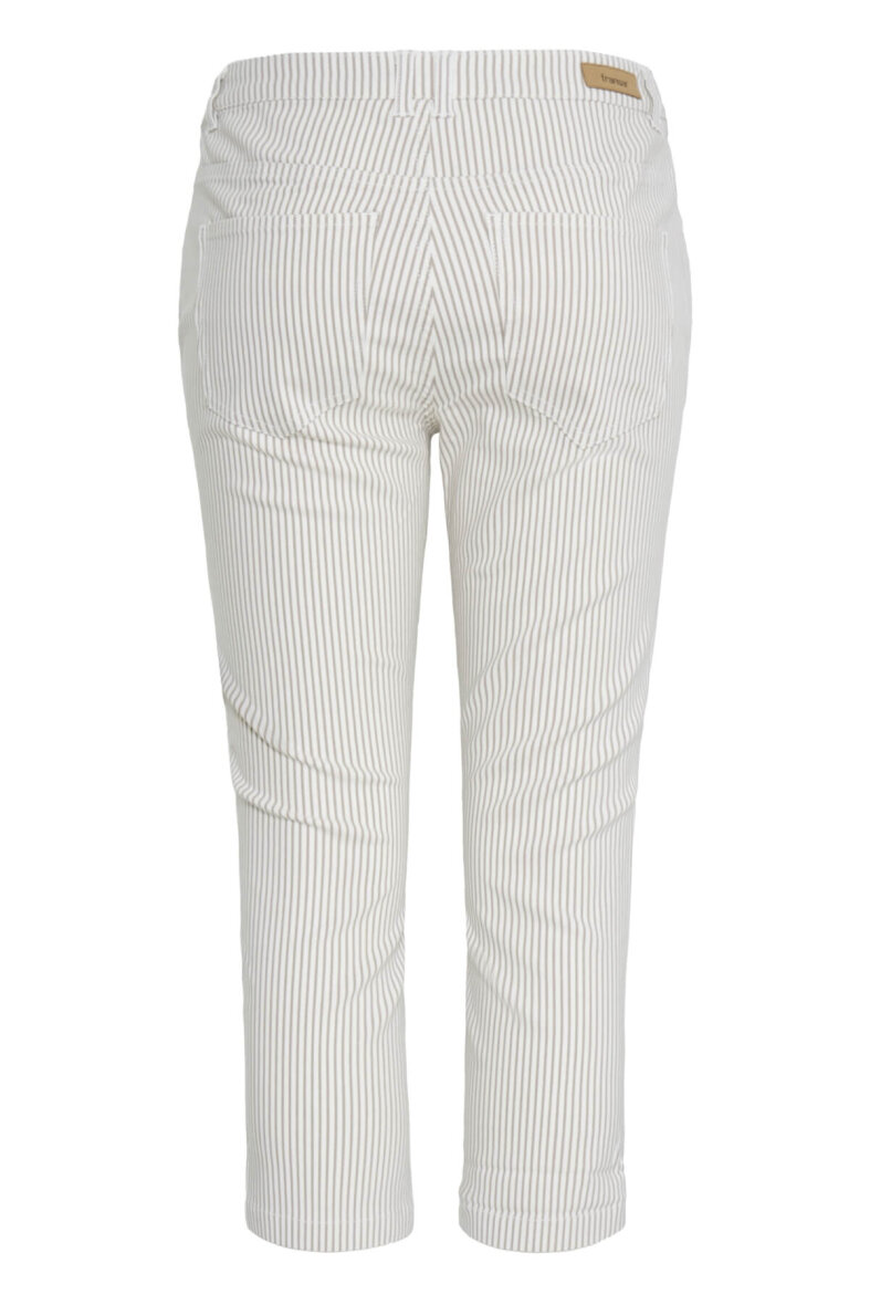 FRANSA stumpebuks med et moderne hvid/brun stribet design. Buksen i modellen TESSA er en slim fit buks med smalle ben. En tætsiddende buks som giver et flatterende silhuet.
