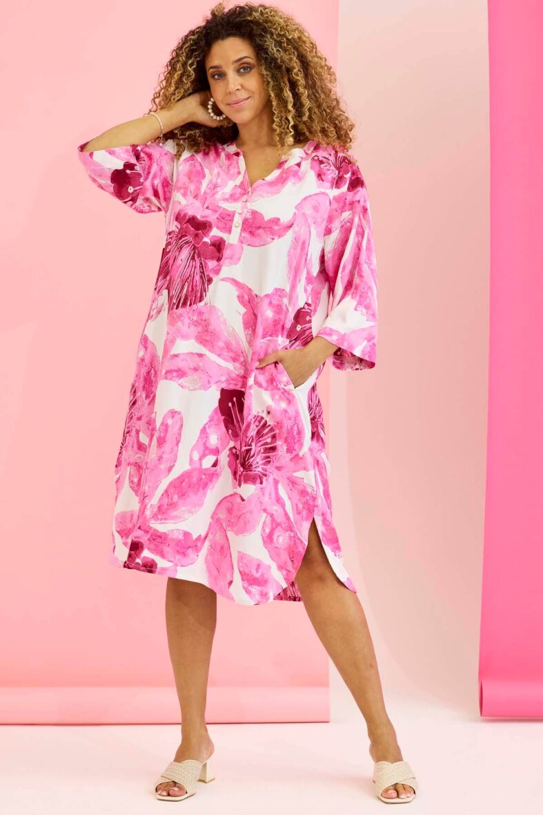 Zhenzi kjole i et smukt print i et mix af pink og lyserøde nuancer.
