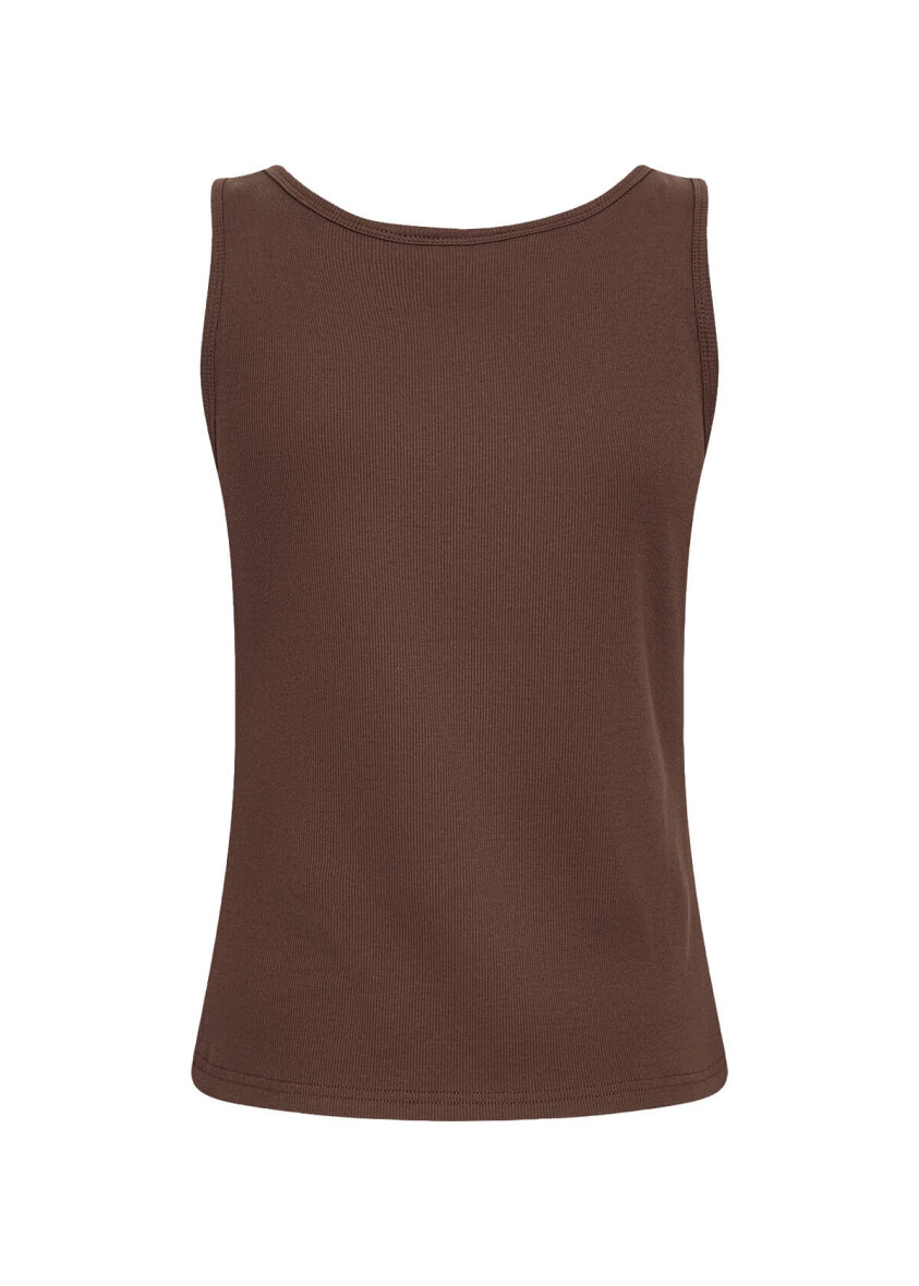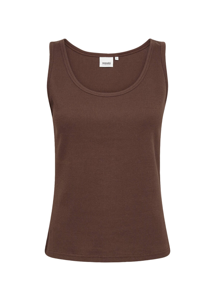 Wasabiconcept top i et flot og enkelt ribbet design. Den brune top er med rund hals, brede skulderstropper og en tætsiddende pasform.