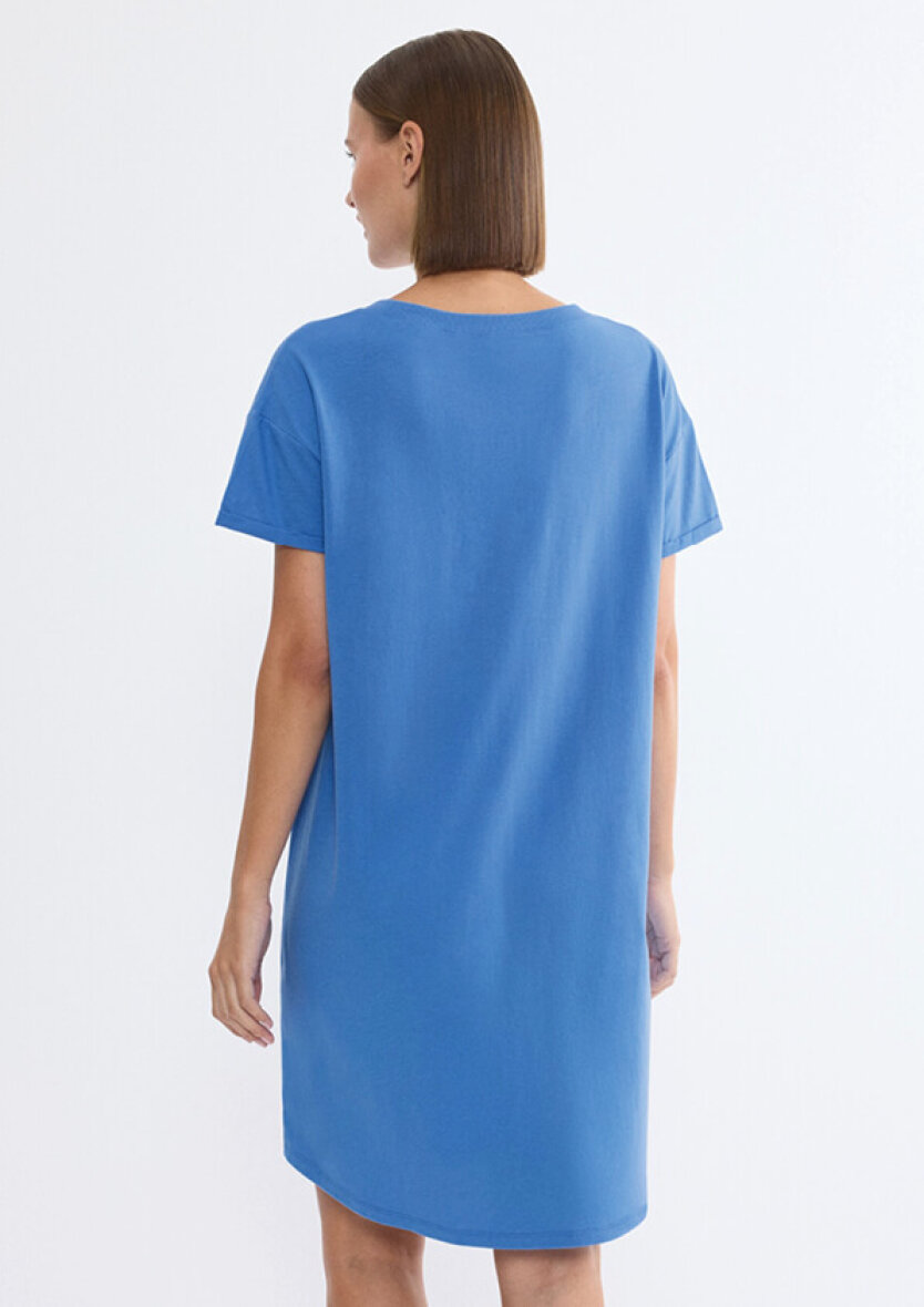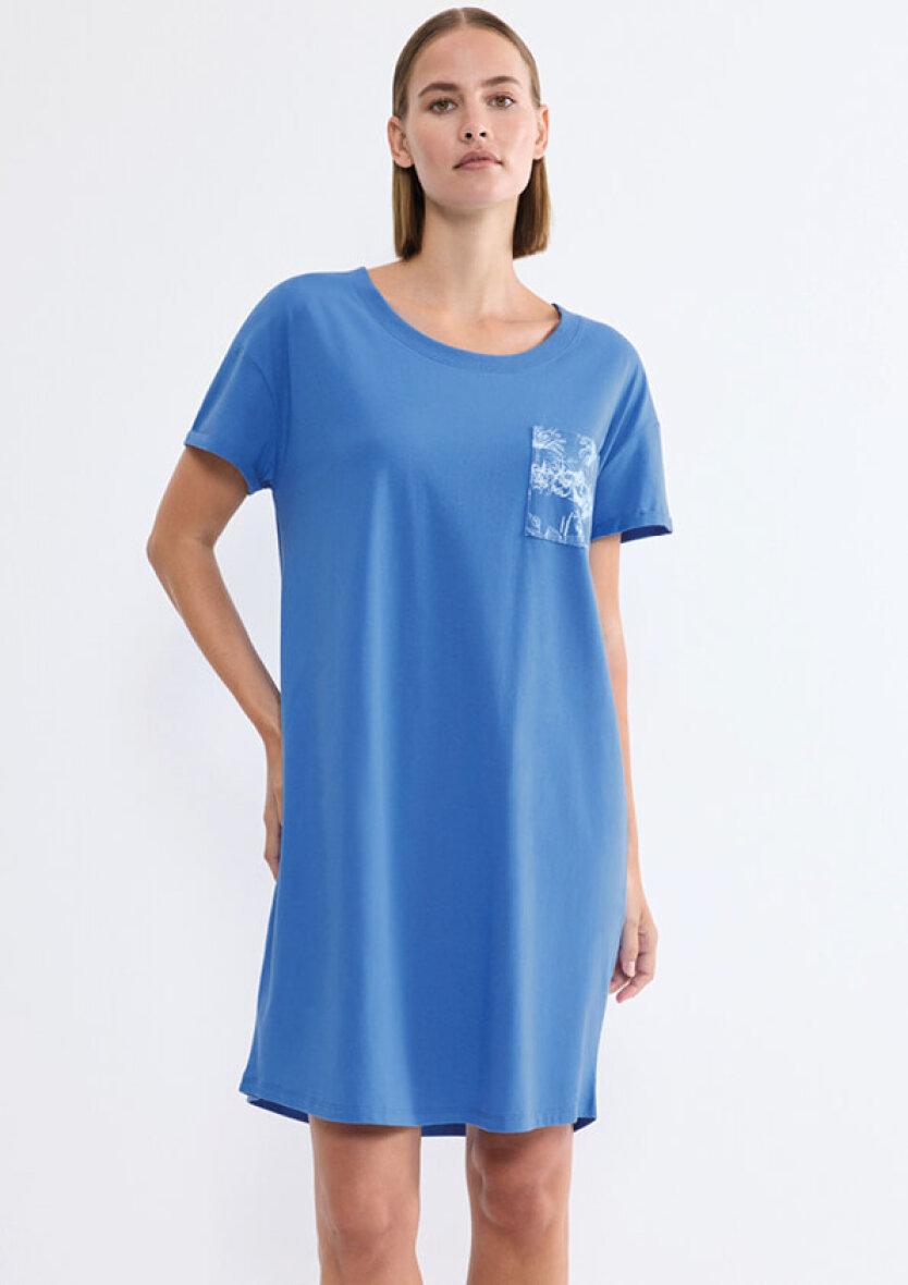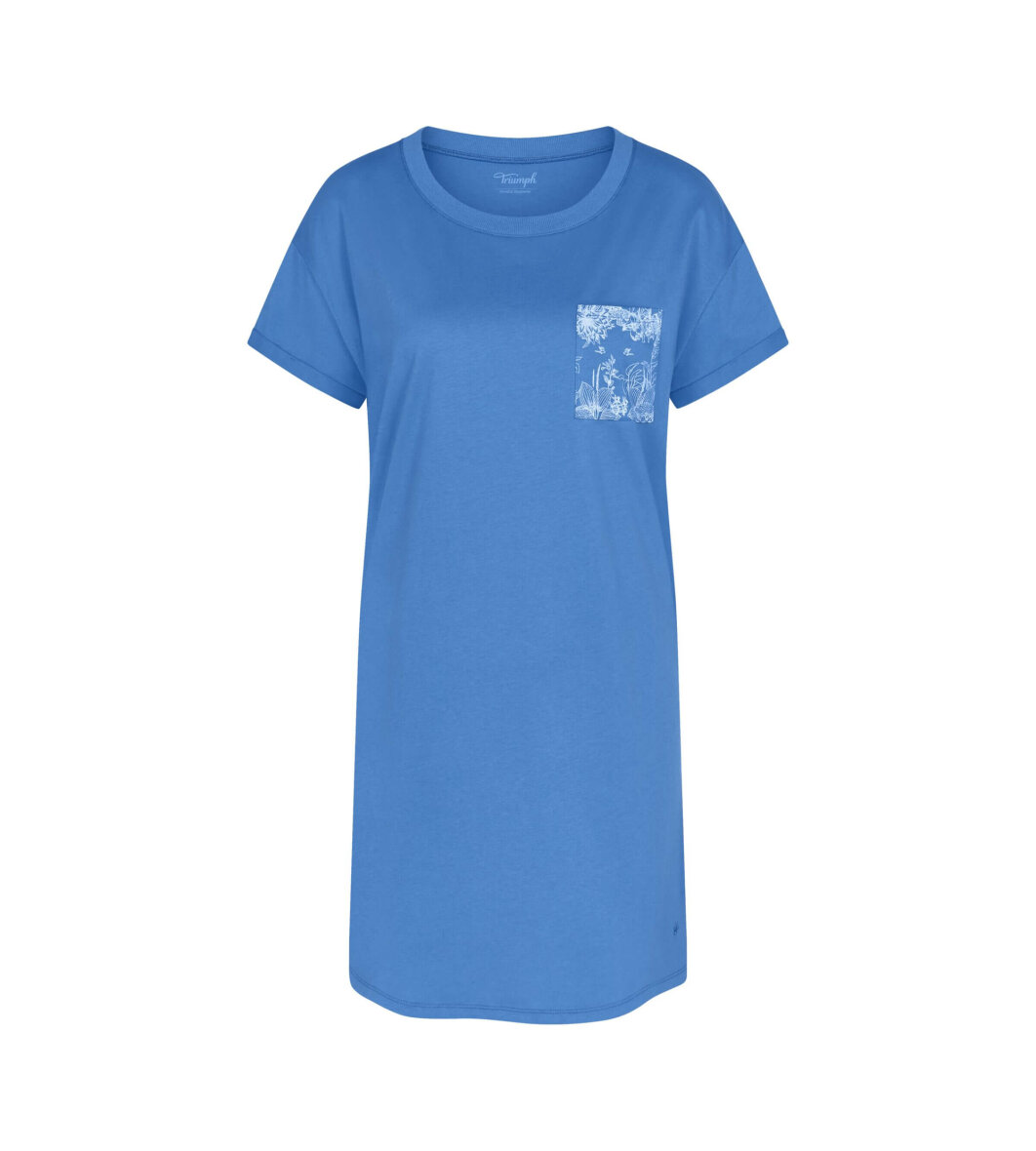 Triumph natkjole i en flot blå farve. Natkjolen er med en åben brystlomme i et diskret hvid mønstret tryk og med et diskret broderet Triumph logo nederst i venstre side.
