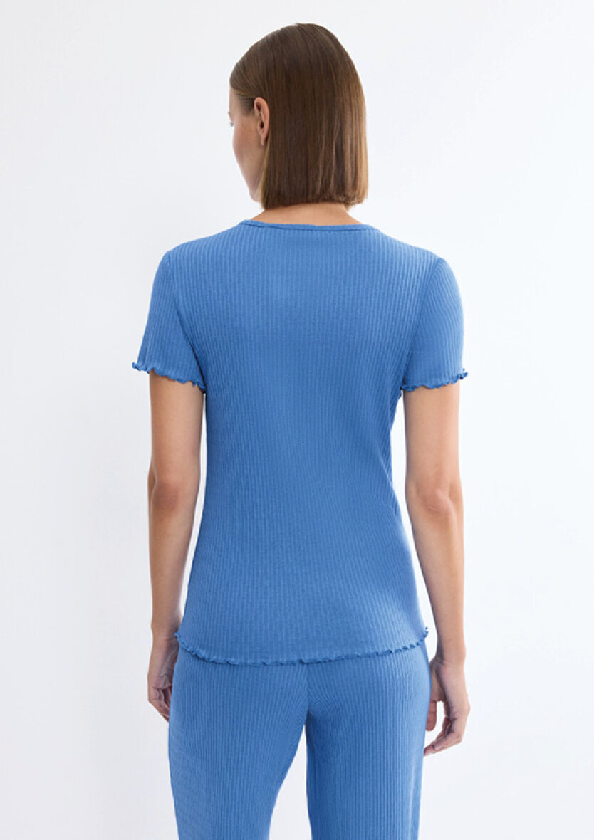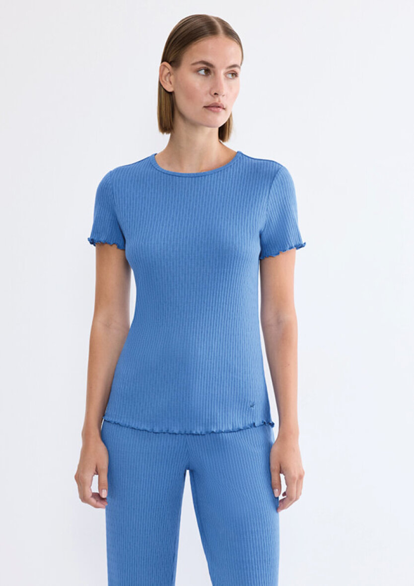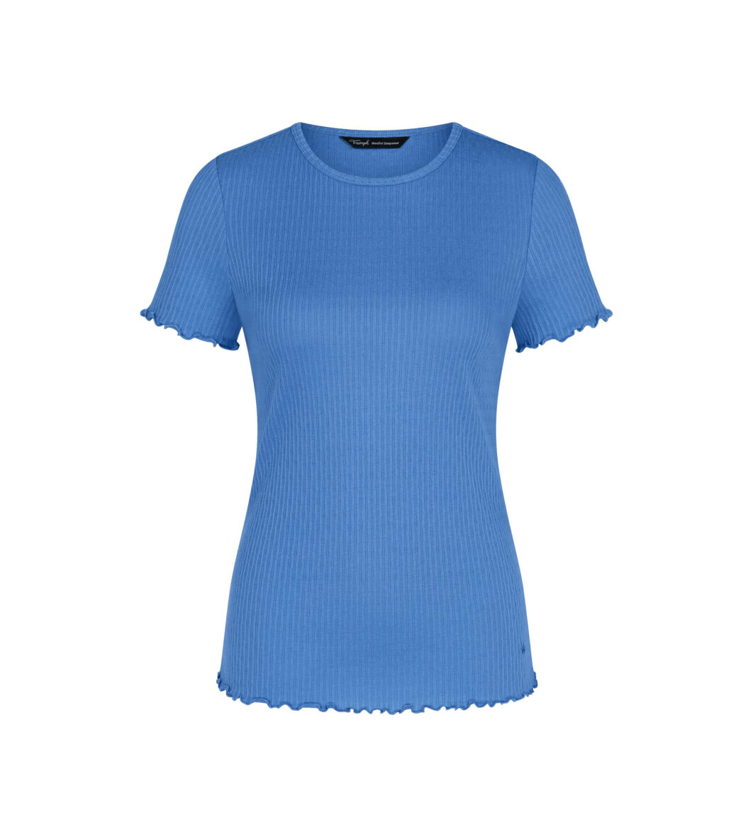 Triumph kortærmet top i en flot blå farve. Toppen er lavet i et enkelt design med striber og diskret mønster, som skaber et feminint udtryk. Toppen er med rund hals og korte ærmer med buede kanter som går igen i bunden, hvilket er med til at skabe et feminint look.