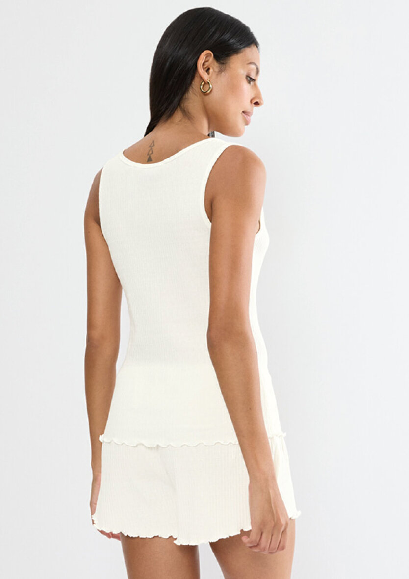 Toppen er med brede stropper og fine buede kanter i bunden. Med det ikoniske triumph logo broderet i matchende hvide farve i bunden.