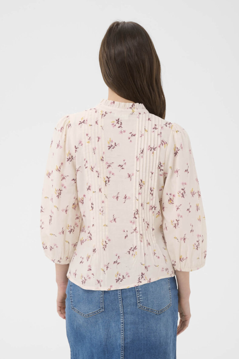 Skjorten er med 3/4 længe ærmer med puf ved skuldrene og elastik, som giver en flot poset effekt.