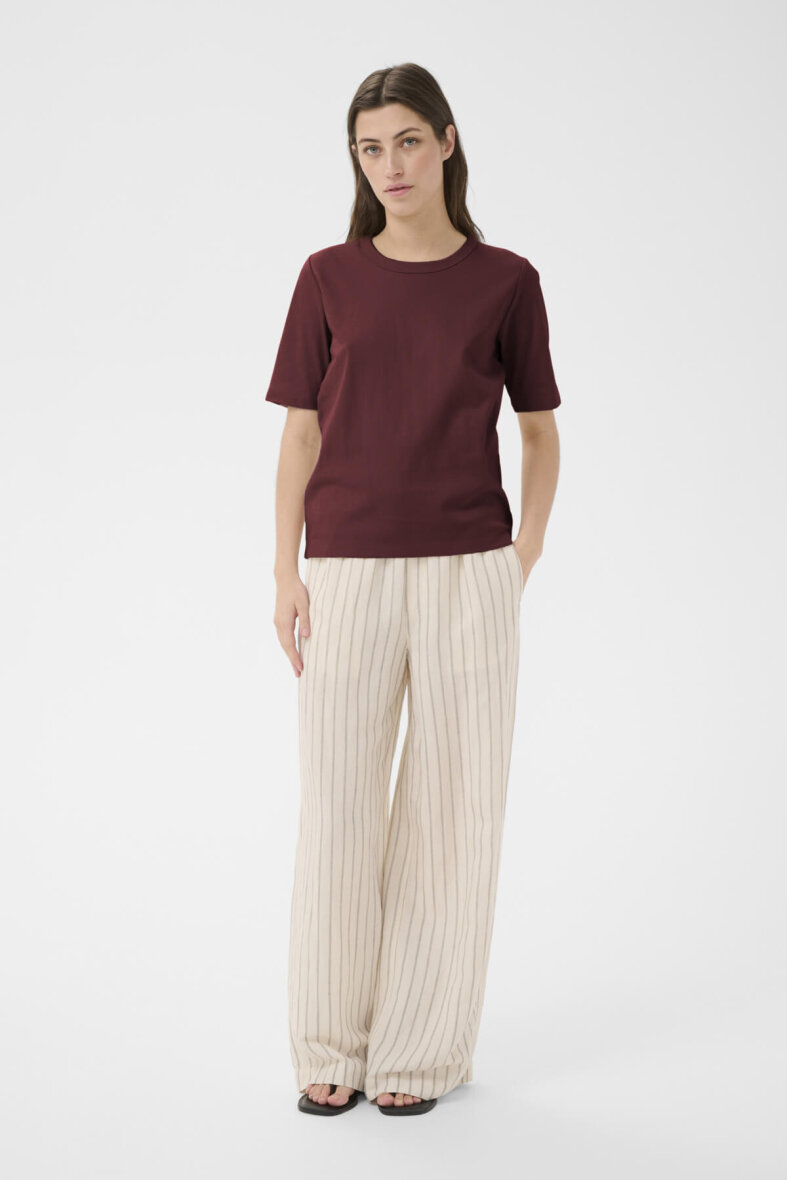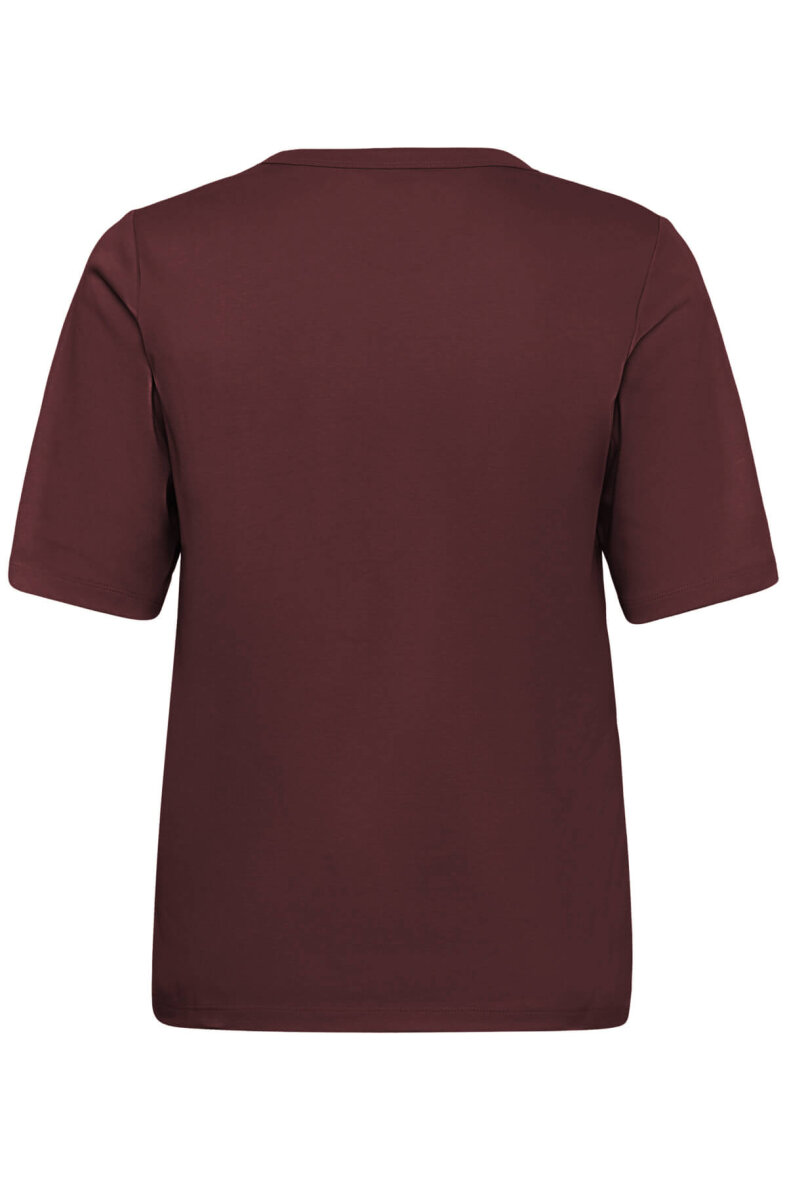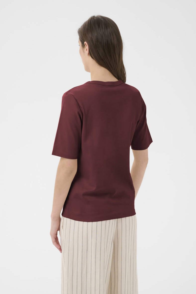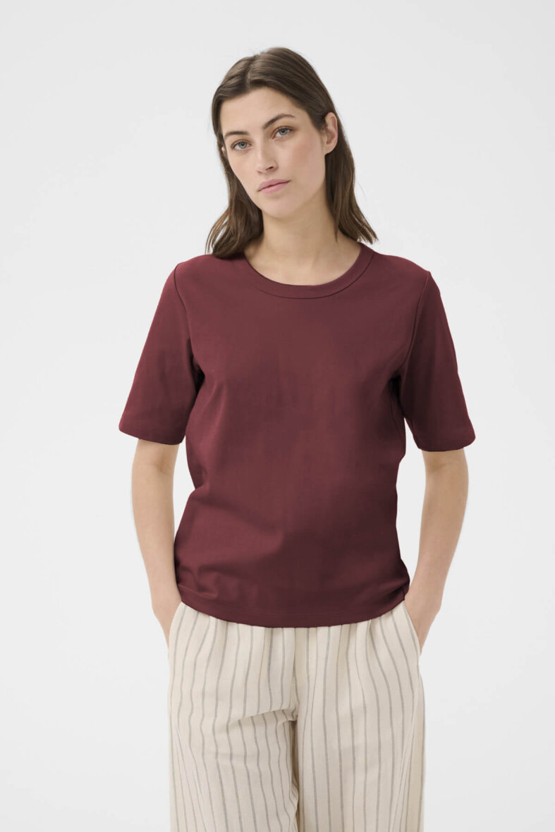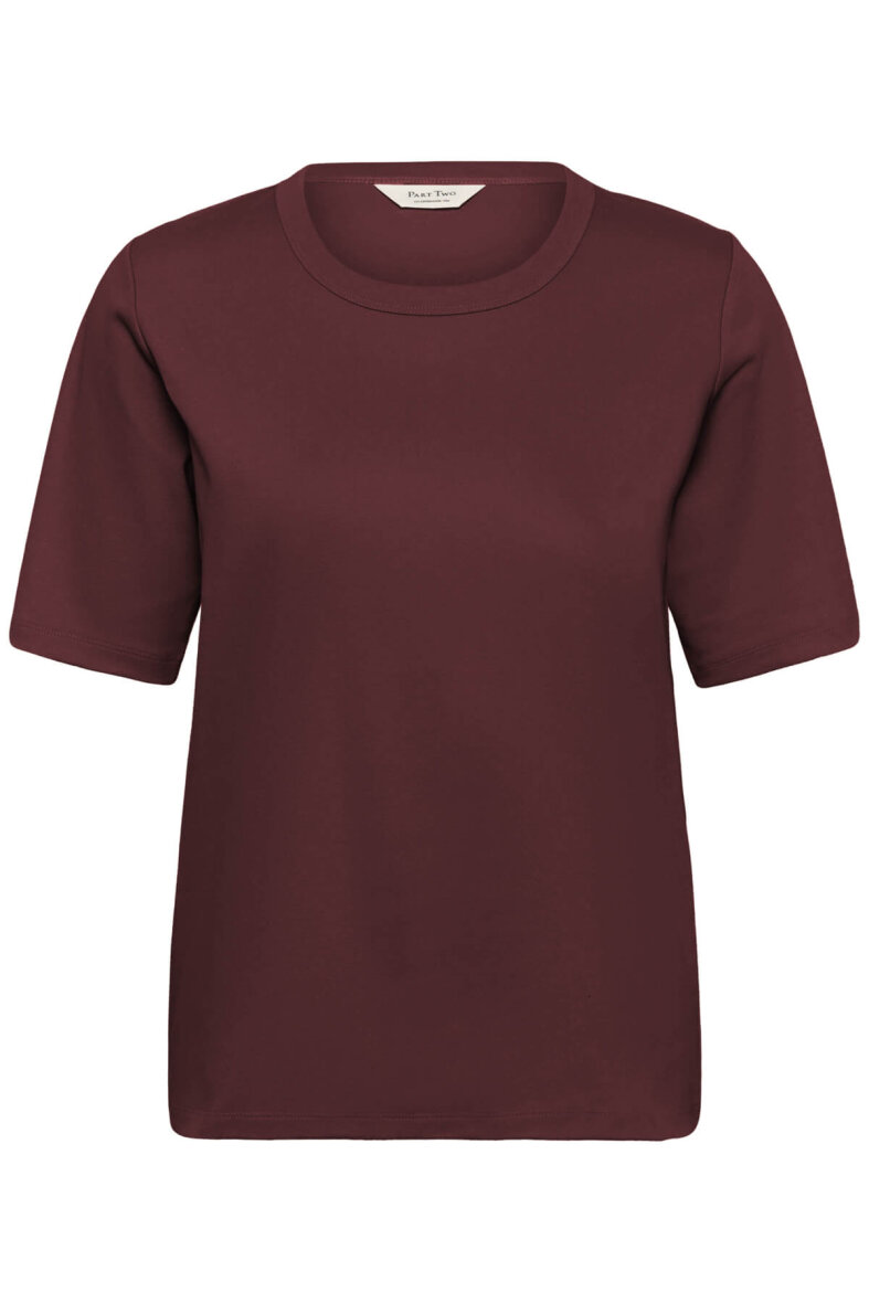 Part Two t-shirt i en dyb rød farve, som giver outfittet varme og klassisk stil med rund hals og korte ærmer.