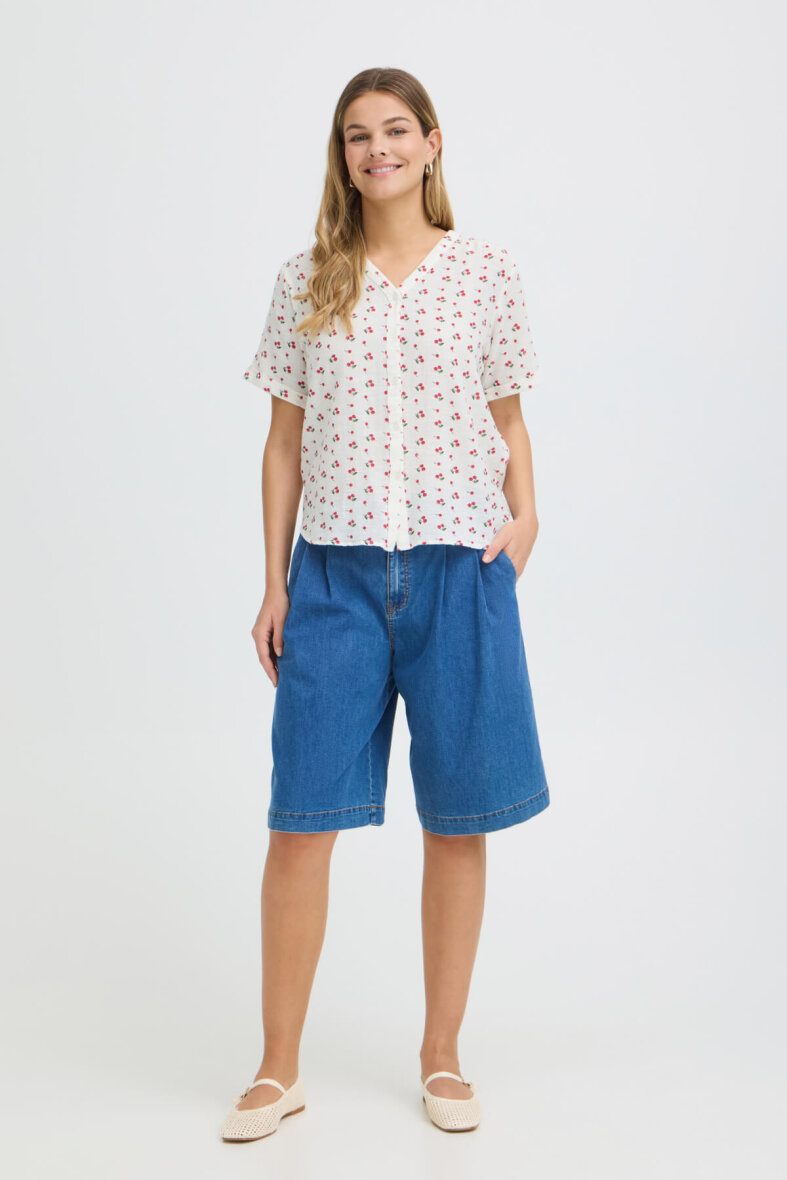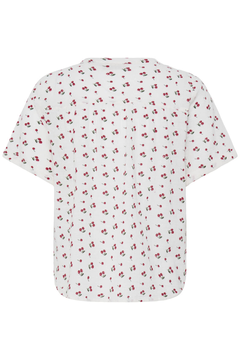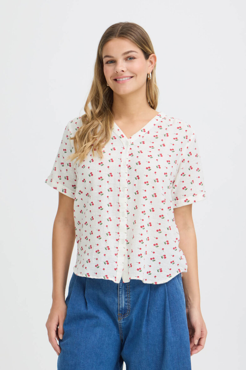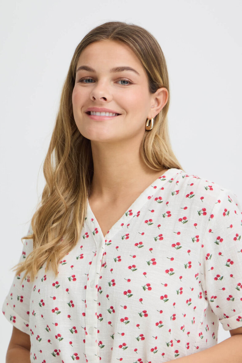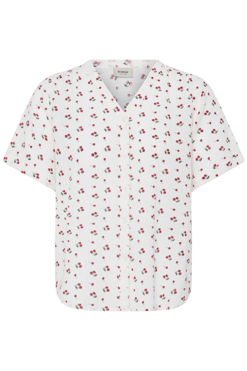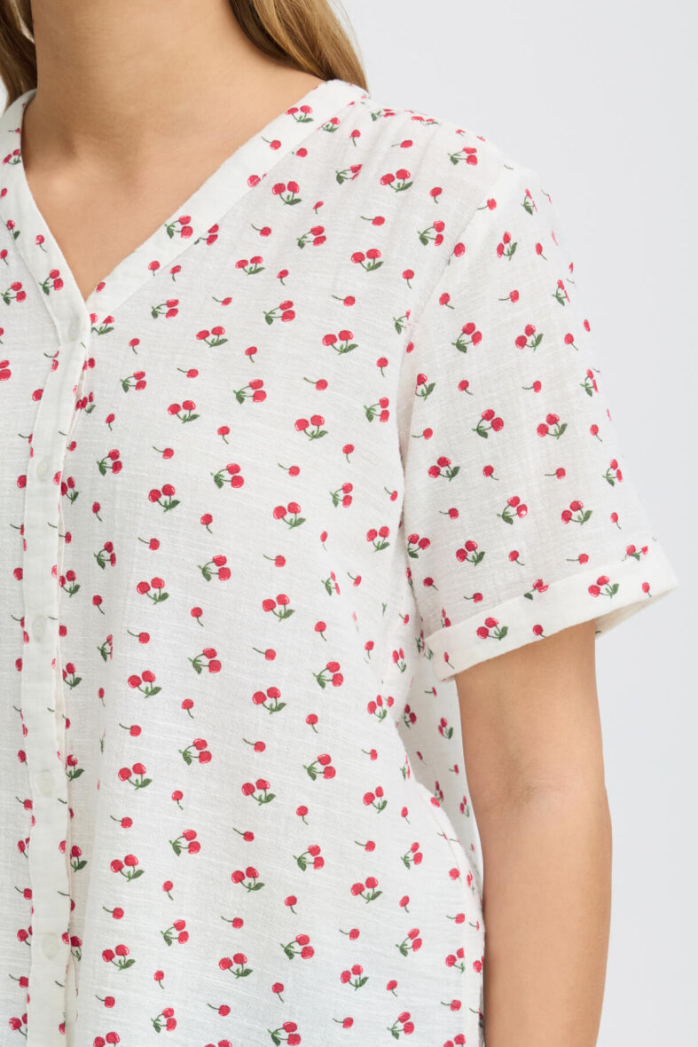 Lækker off white skjorte fra FRANSA i et enkelt design med røde kirsebær all-over. Skjorten er lavet i en blanding af bomuld og hør, hvilket gør skjorten åndbar og luftig og perfekt til de varme sommermåneder.