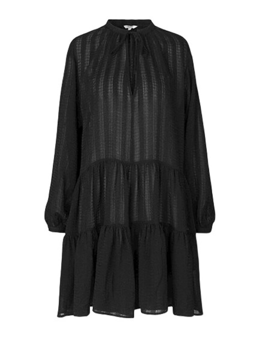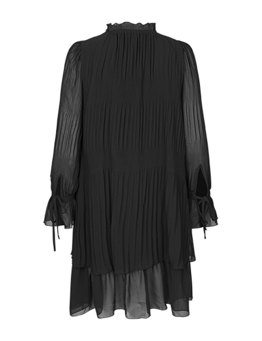 Skøn kjole fremstillet i et let materiale fra mbyM. Rund hals med snøre og V-udskæring. Løs pasform og syet med flæseeffekt. Kjolen er en smule længere bagtil.