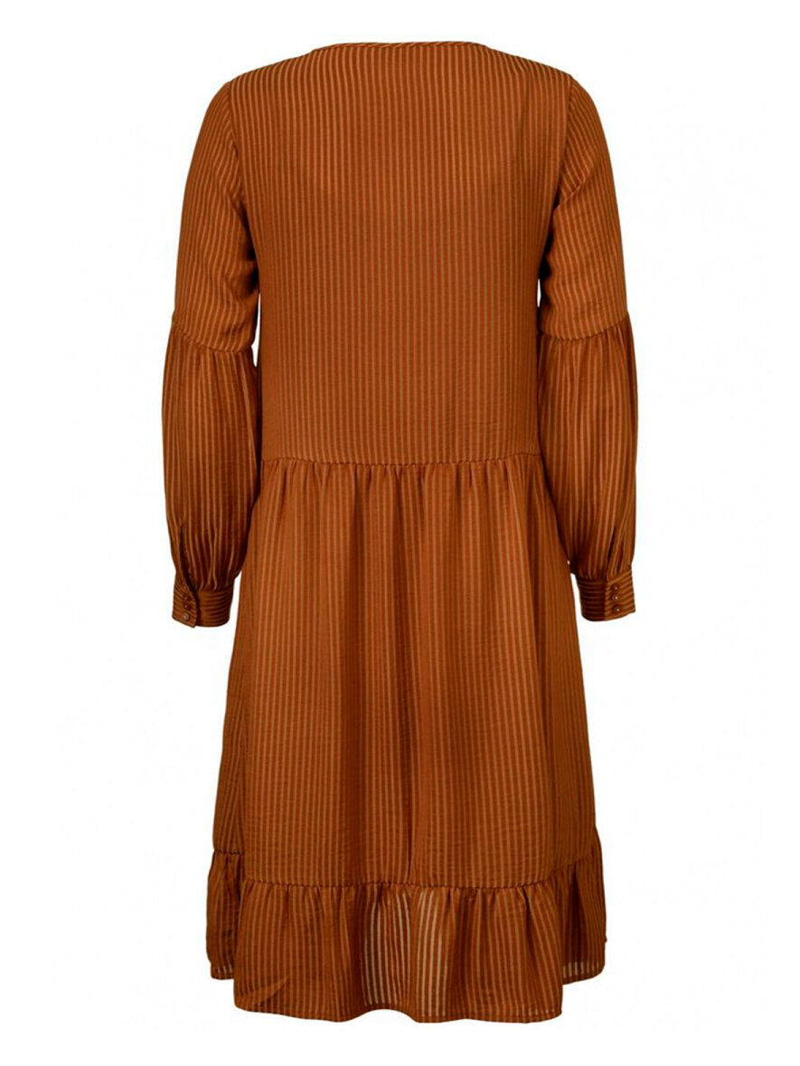 Fin og elegant kjole i stribet stof. Rich dress har lange ærmer og bliver lukket fortil af en enkel knap ved hals. Kjolen har skæring ved talje og hen over ærmer, der giver balloneffekt samt brede manchetter ved ærmer. Underkjole medfølger.
