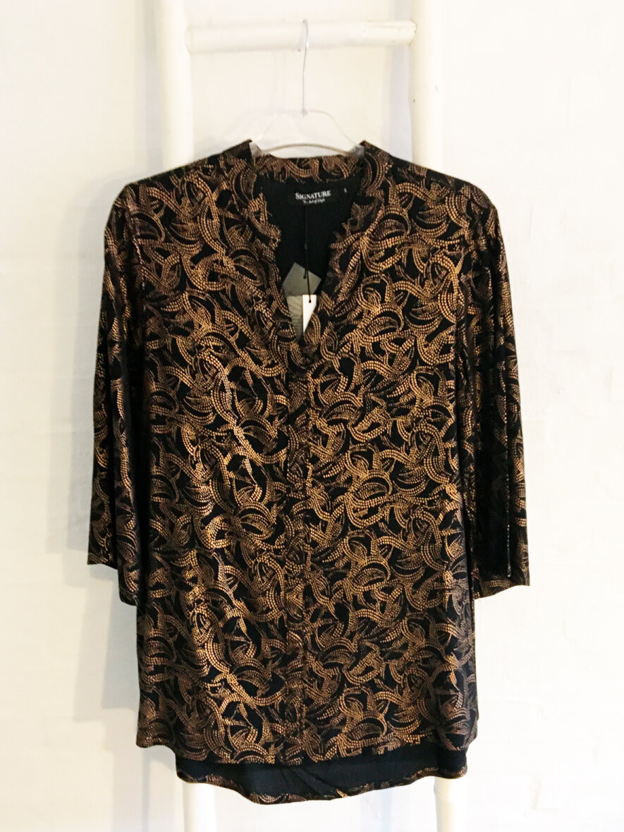 Smuk tunika fra Signature med guldprint på sort baggrund. Tunikaen har lille kinakrave der går ned i V-udskæring. 3/4 ærmer.