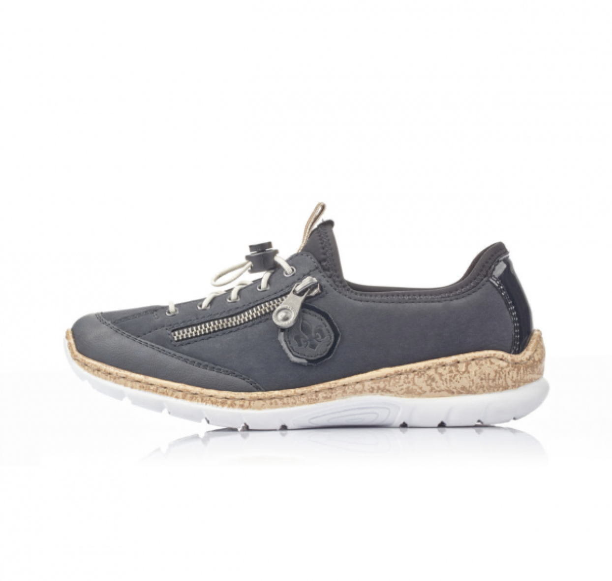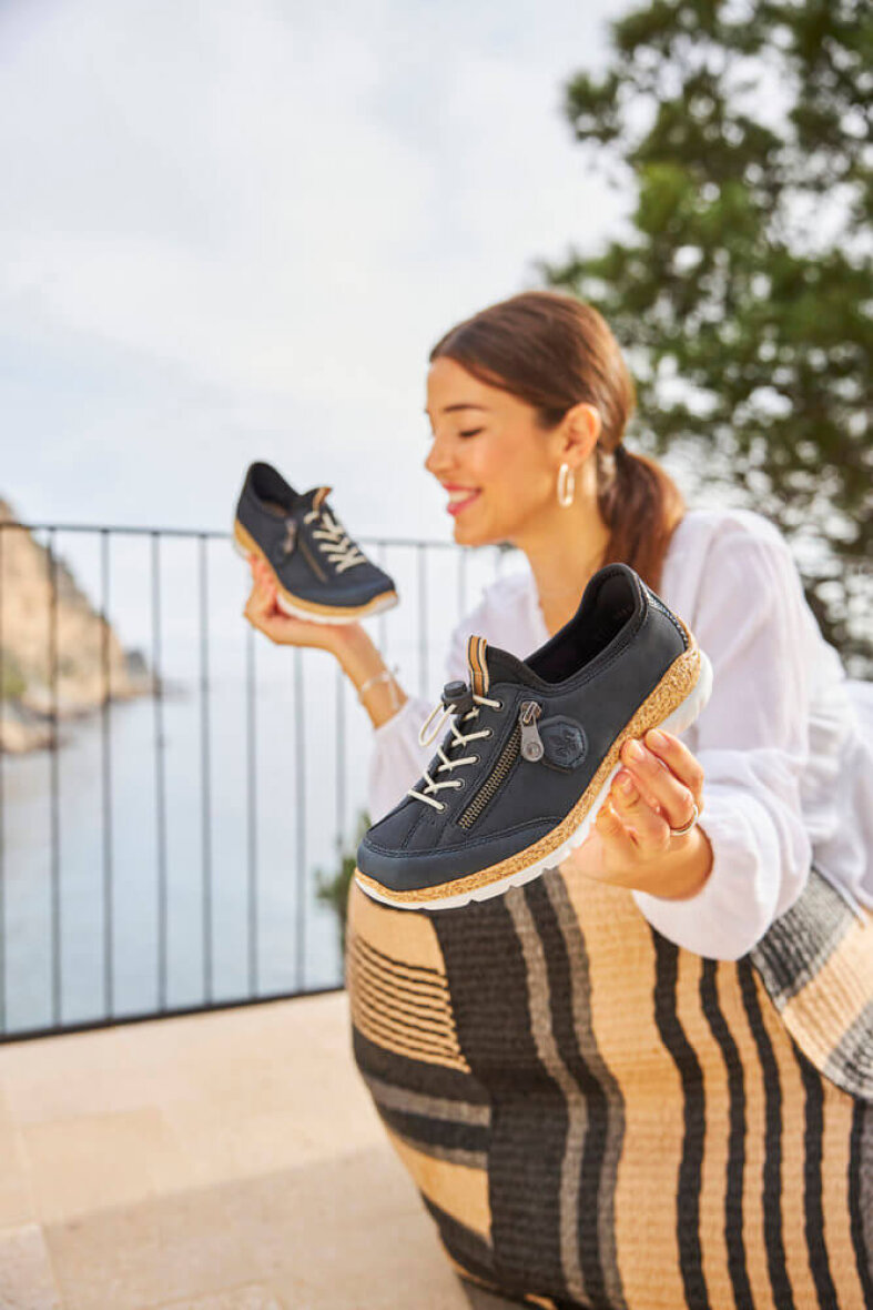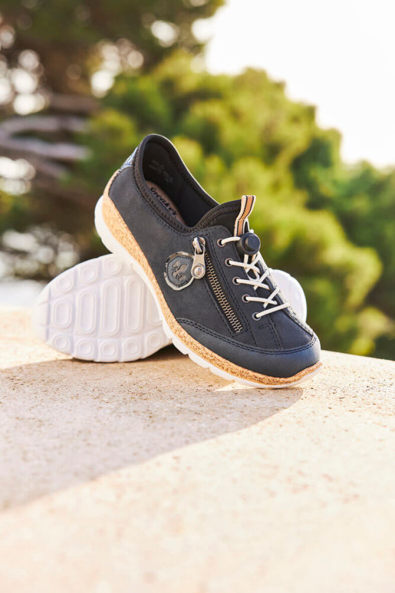 Rieker snakers i en flot mørkeblå farve. Den populære Rieker model er med elastik snøre, som kan spændes, så den er nem at få af og på.