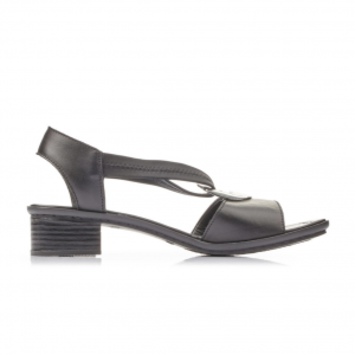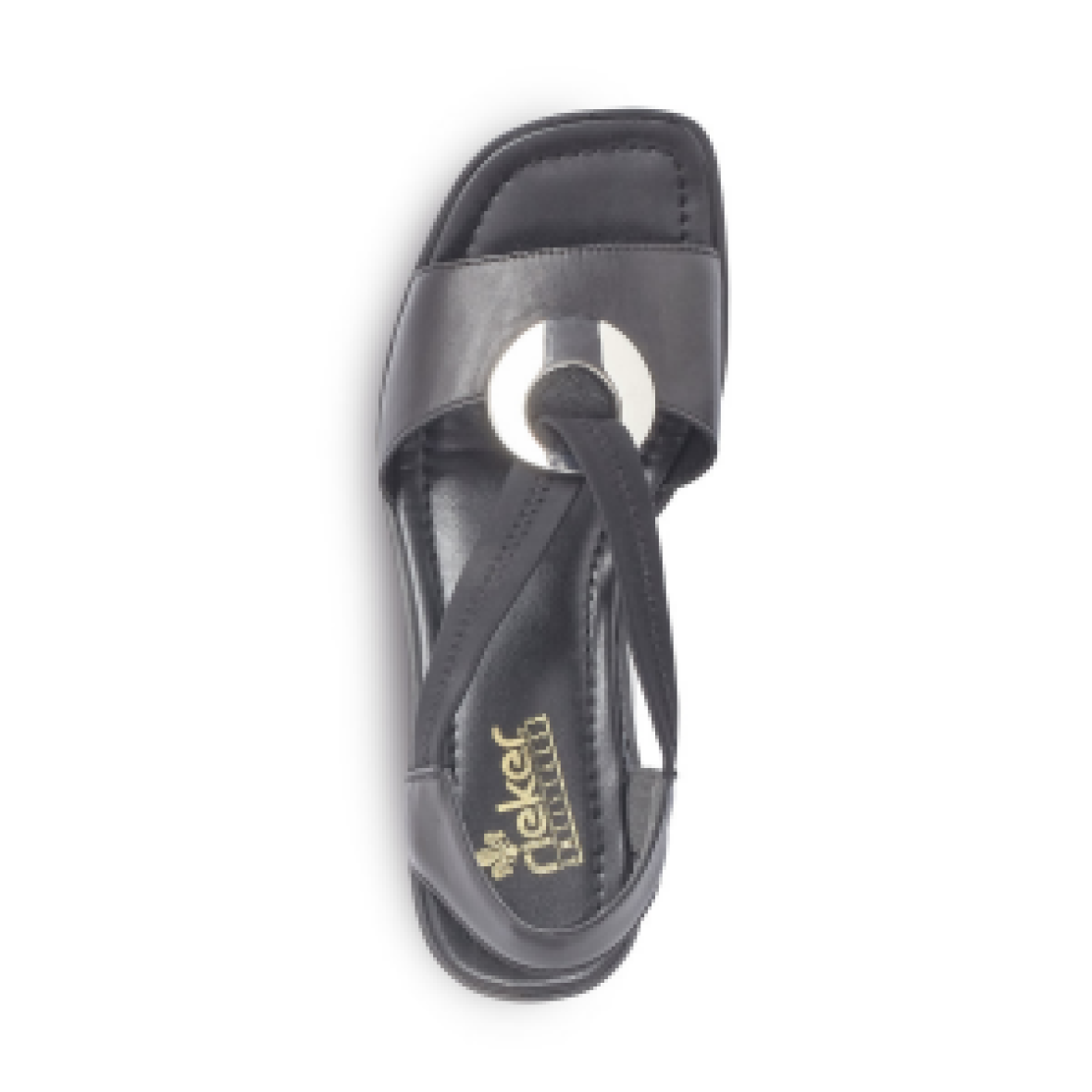 Super flotte sandaler fra Rieker. Modellen har elastikremme, så den sidder godt fast på foden. Indersålen er i blødt materiale så skoen er komfortabel at have på. Sandalen har en flot dekorativ metal ring foran, som giver et feminint look.