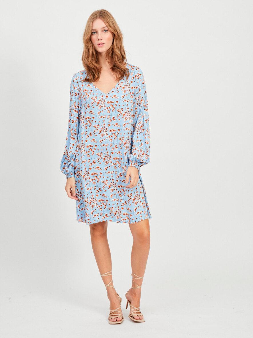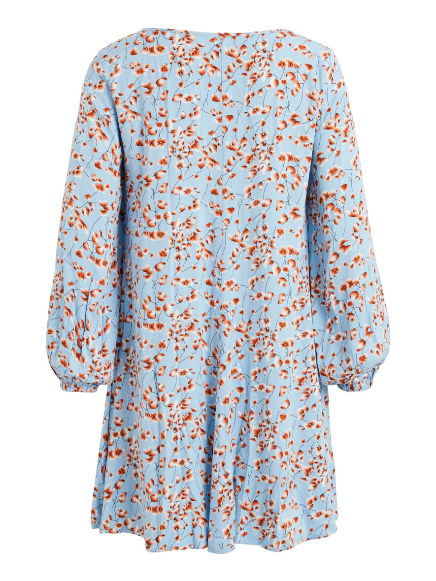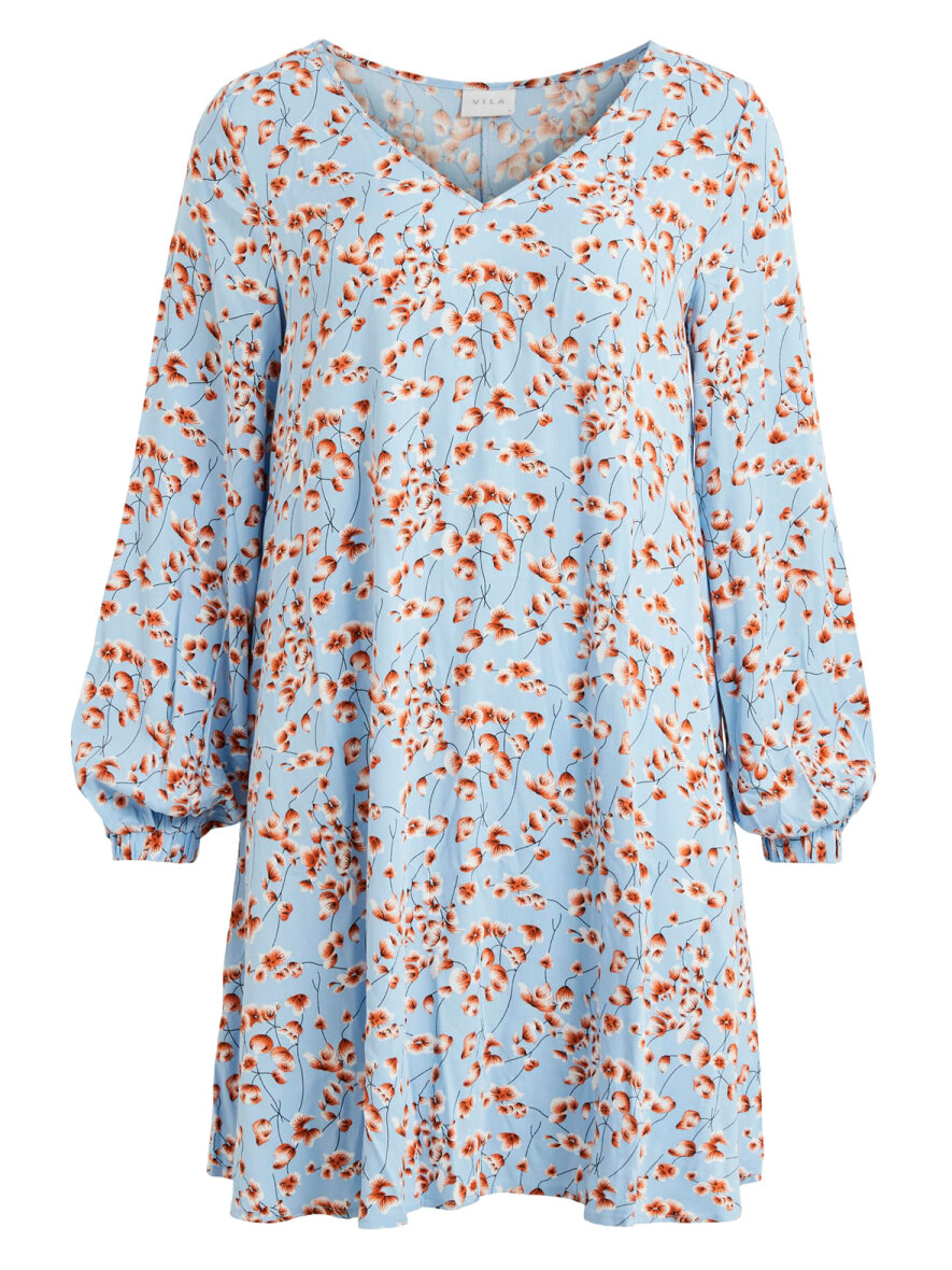 Smuk kjole fra VILA. Kjolen har løs pasform, lange ærmer med elastik kant og V-hals. Kjolen er designet i et skønt print med rødlige blomster på den blå baggrund.