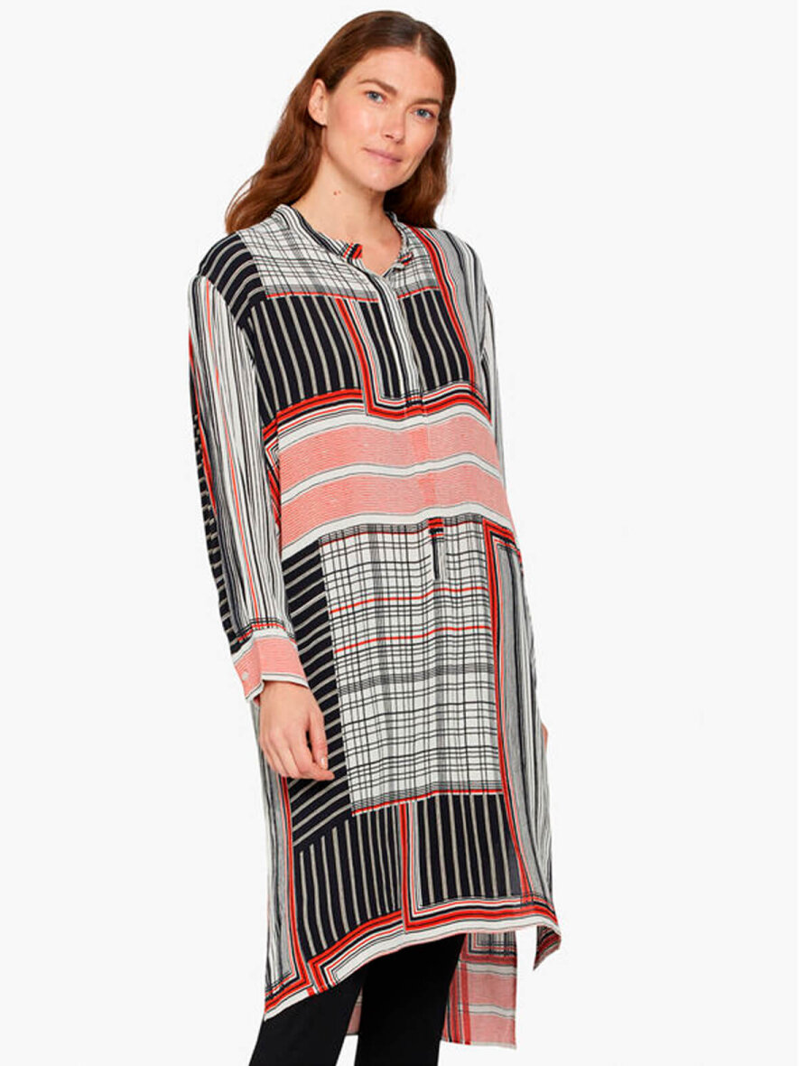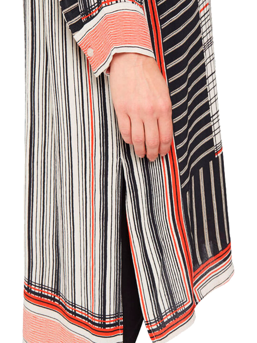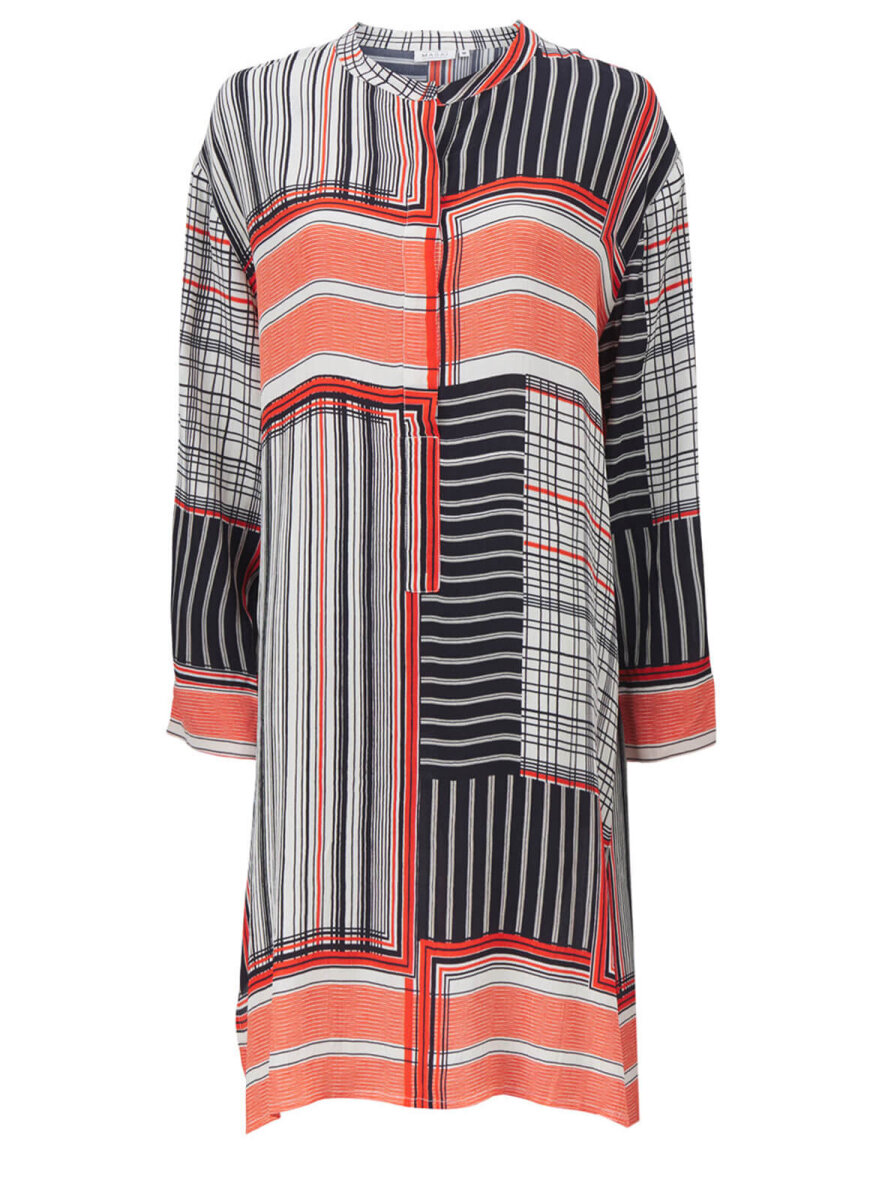De klassiske striber har på denne kjole fået et moderne twist i kombination af røde, blå og hvide nuancer. Den glatte viskose er blød og lækker at have på, og kjolen har et klassisk snit med lige linjer, der klæder den kvindelige krop. Skjult knapstolpe foran med 3 knapper. Høje slidser i siderne og er længere bagpå. En stilren kjole med ubesværet komfort. Max 5% krymp.