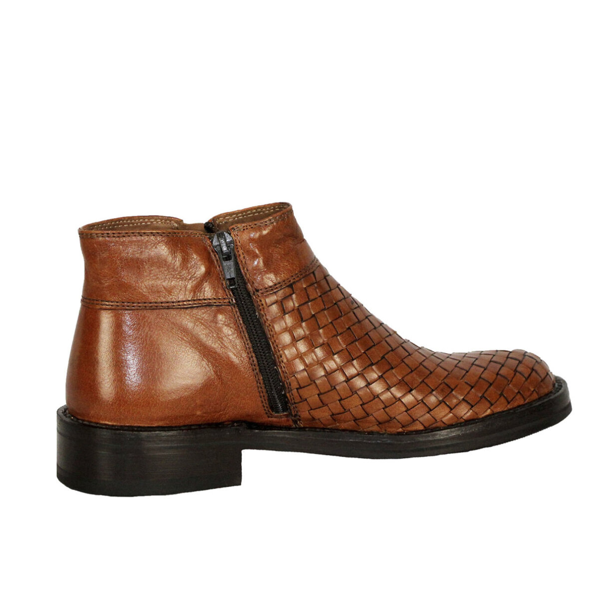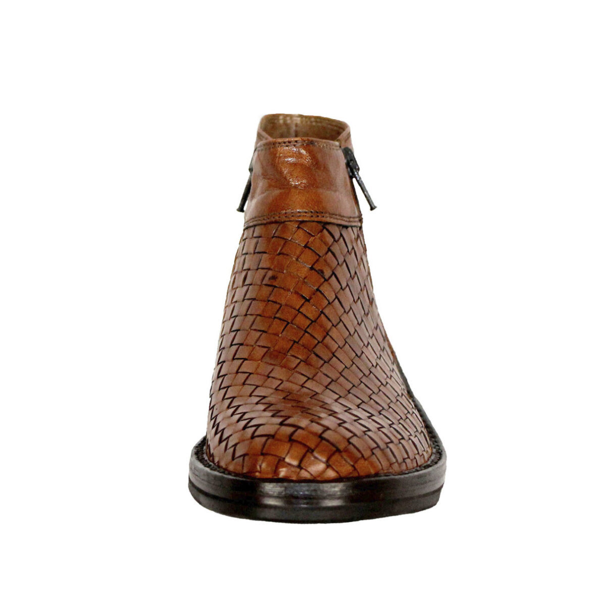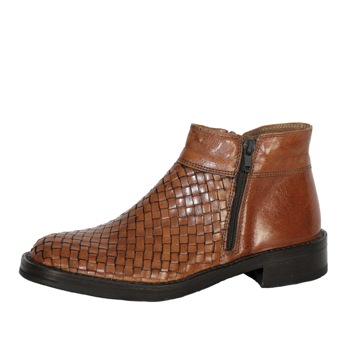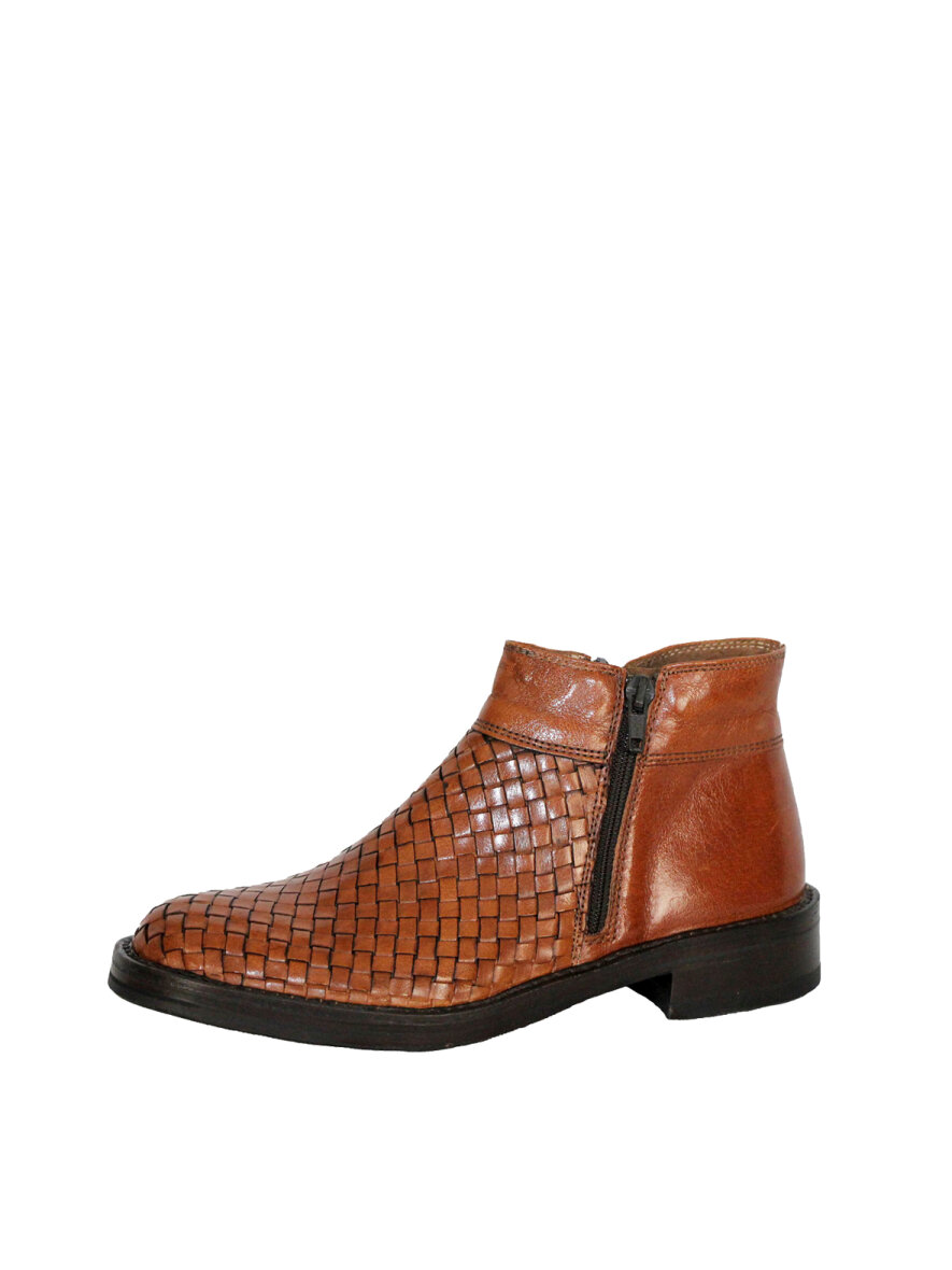 Flot klassiker fra Bubetti. En kort cognac farvet støvle lavet i vegetabilsk garvet skind. Overdelen er lavet i flot flet detaljer med dobbelt lynlås, så den re nem at komme i. Støvlen har en god pasform, og kan passe til ethvert outfit.