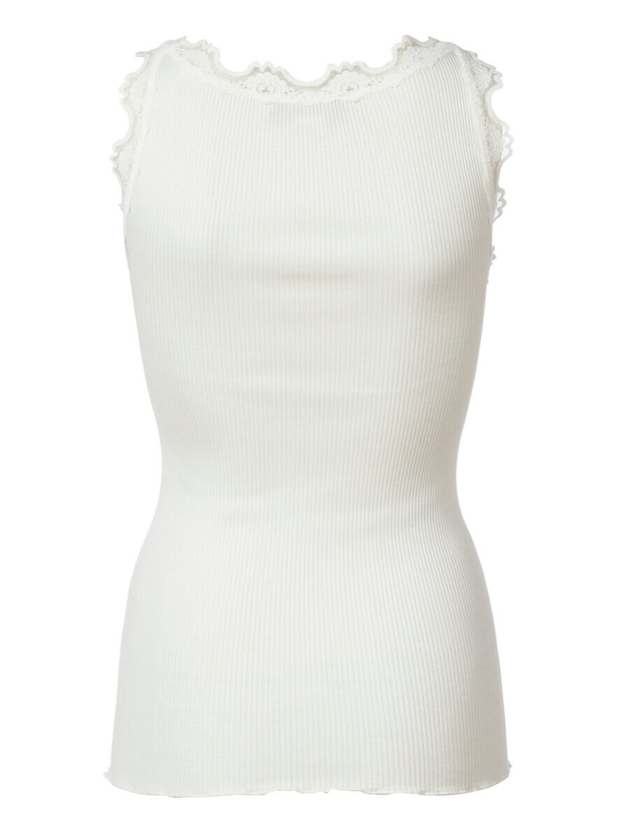 Virkelig lækker basis top fra Rosemunde. Toppen har blondestropper og en dejlig blød ribbet kvalitet. Farve: New White.