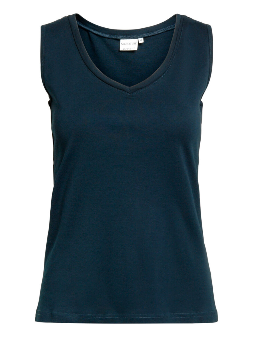 Lækker basis top i super behagelig og komfortabel kvalitet fra Signature. Toppen er designet med bred V-hals og ensfarvet. Kan bruges til en nederdel og under en fin strik eller bluse. Max 5% krymp.