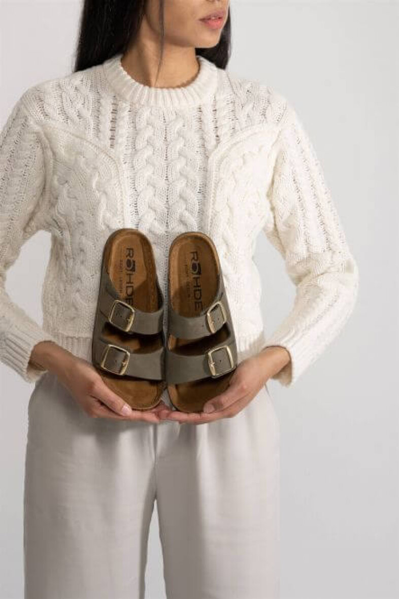 Klassisk sandal fra Rohde i den skønne army grønne farve. Overdelen er lavet i skind med nogle fine stikninger i siden. Sandalen kan reguleres med to spænderemme. Indlægssålen er en blød skind sål, som dine fødder vil komme til at elske. Modellen er let og fleksibel.