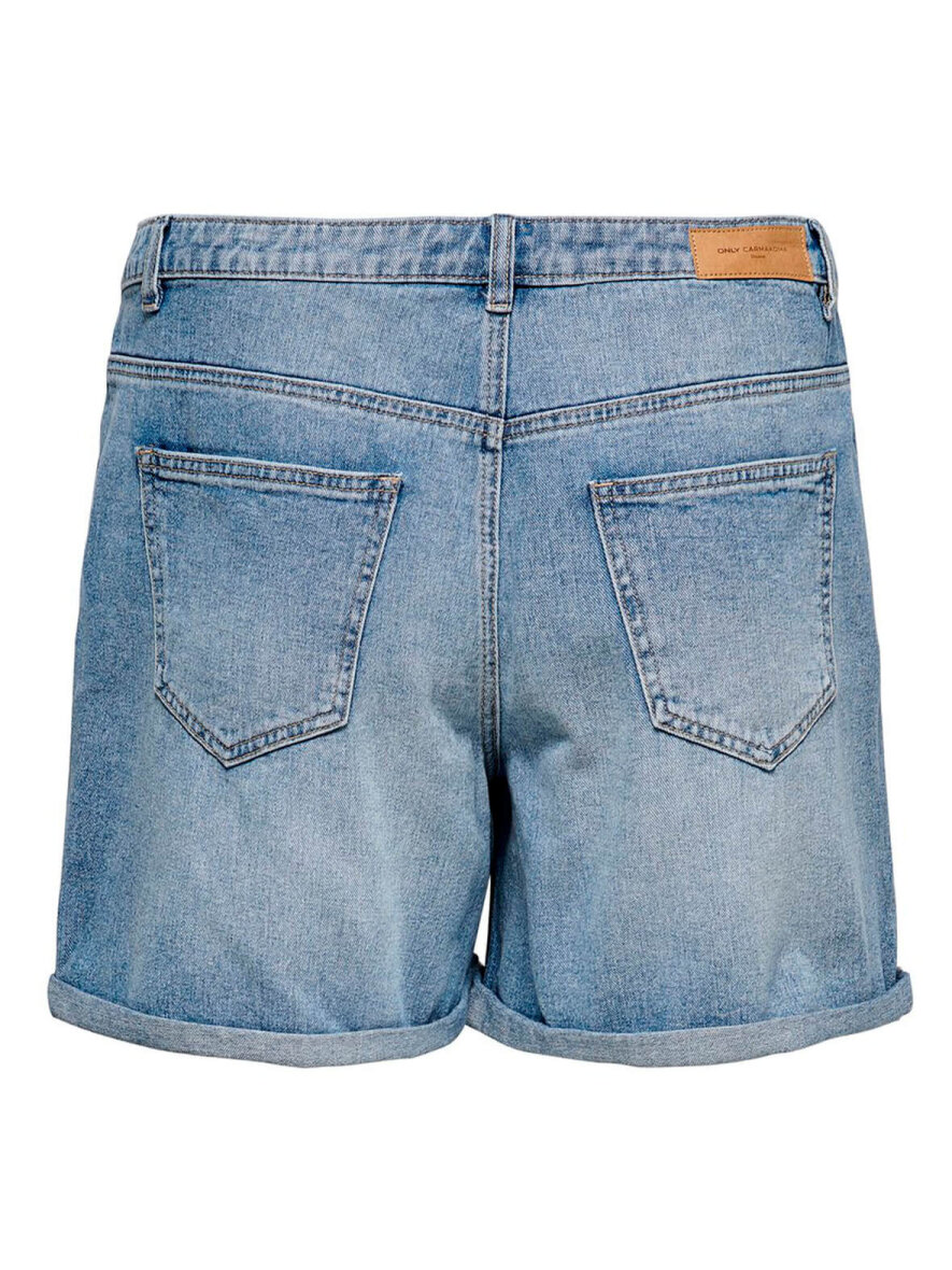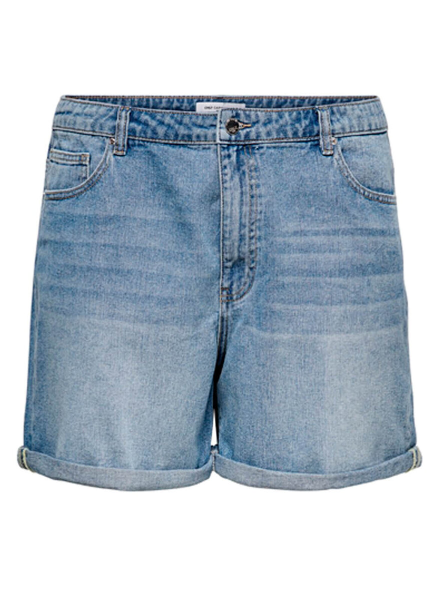 Curvy denim shorts fra Only Carmakoma. Lukning foran med knap og lynlås. 5-lommer og bæltestropper. Lille opsmøg på benene.