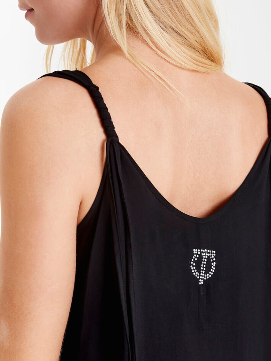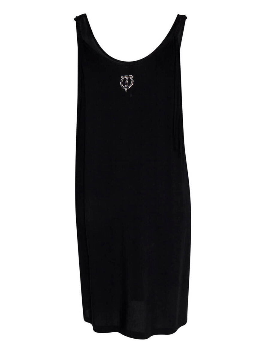 Skøn let og enkel kjole fra Pulz Jeans. Kjolen har brede stropper fortil, men snoet detalje bagtil. Bagpå små simili sten. Max 5% krymp.