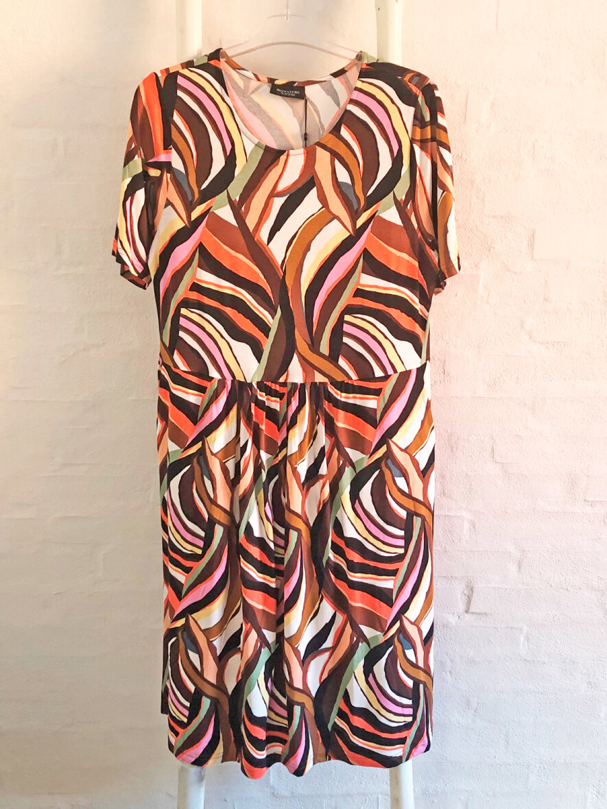 Smart knælang kjole fra Signature med korte ærmer og rund halsudskæring. Kjolen er designet i et flot mønstret print og så har den en god behagelig pasform. Overskåret i taljen, der giver lidt rynkeeffekt ned foran. Sidelommer. Max 5% krymp.