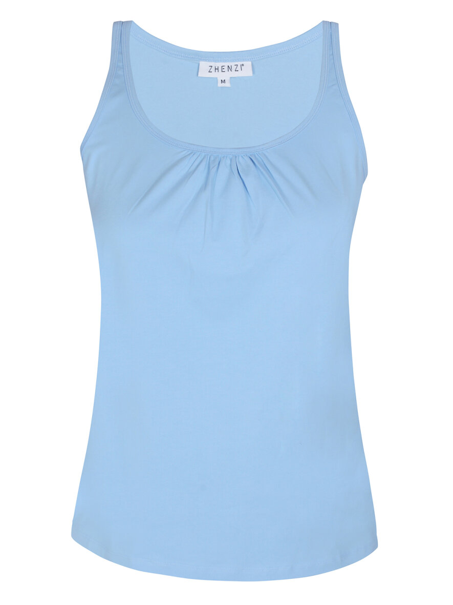 Super skøn top fra Zhenzi i en behagelig blød bomuld med masser af stretch. En virkelig dejlig basis top i den lækreste kvalitet og med en flot, lang længde. Toppen har gode, brede stropper og en tilpas dyb udskæring i halsen - både foran og bag. Halsudskæringen har smarte rynkedetaljer ved halsudskæring foran.