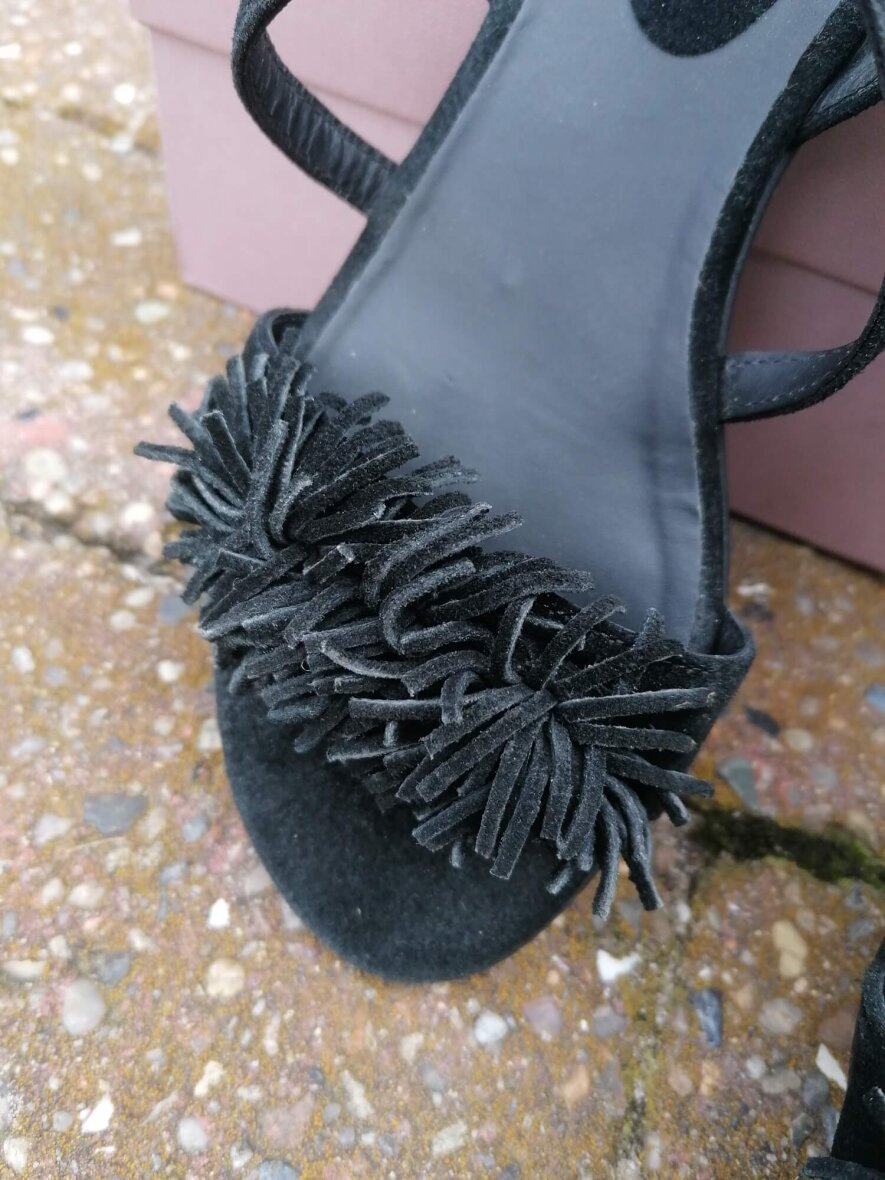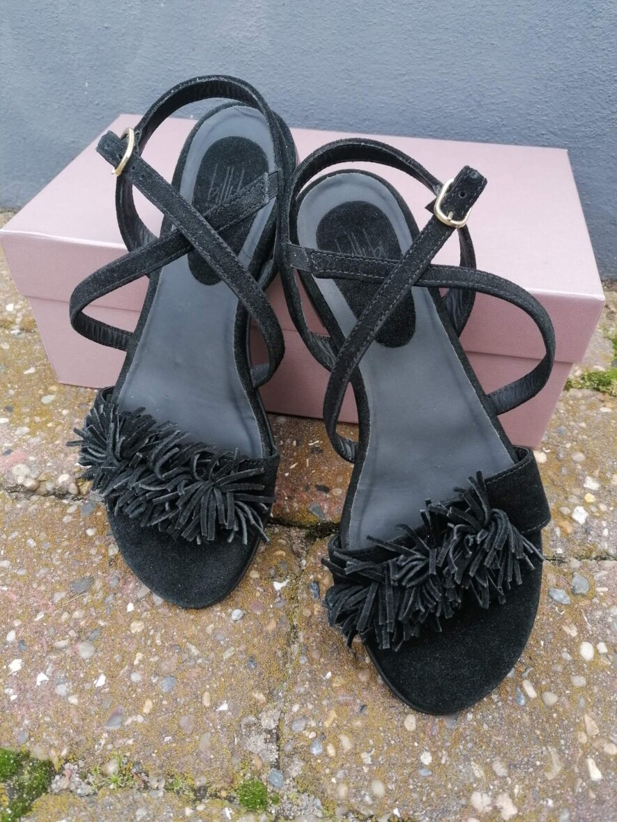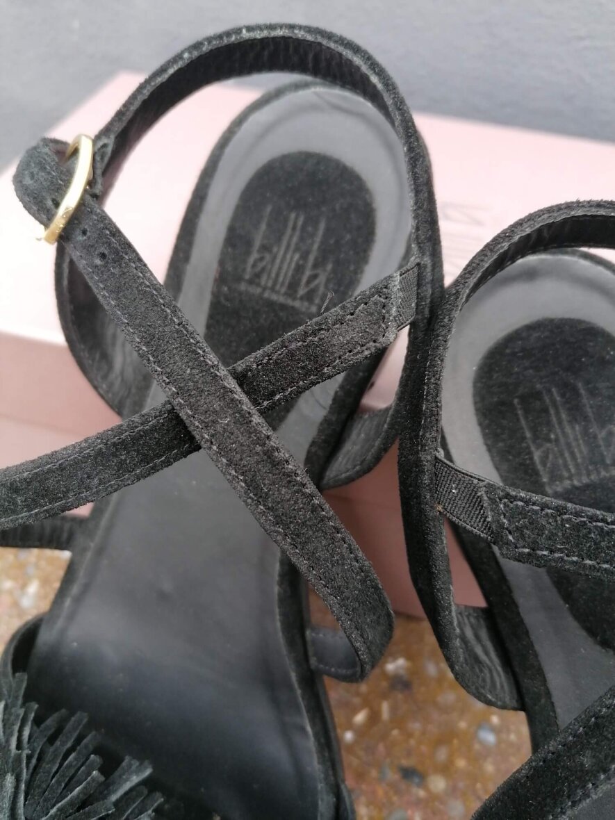 Flotte håndlavede sandaler i sort ruskind fra Billi Bi. Sandalen er flot dekoreret med frynser på remmen over forfoden. Sandalen er med smalle krydsremme som lukkes med ankelspænde.