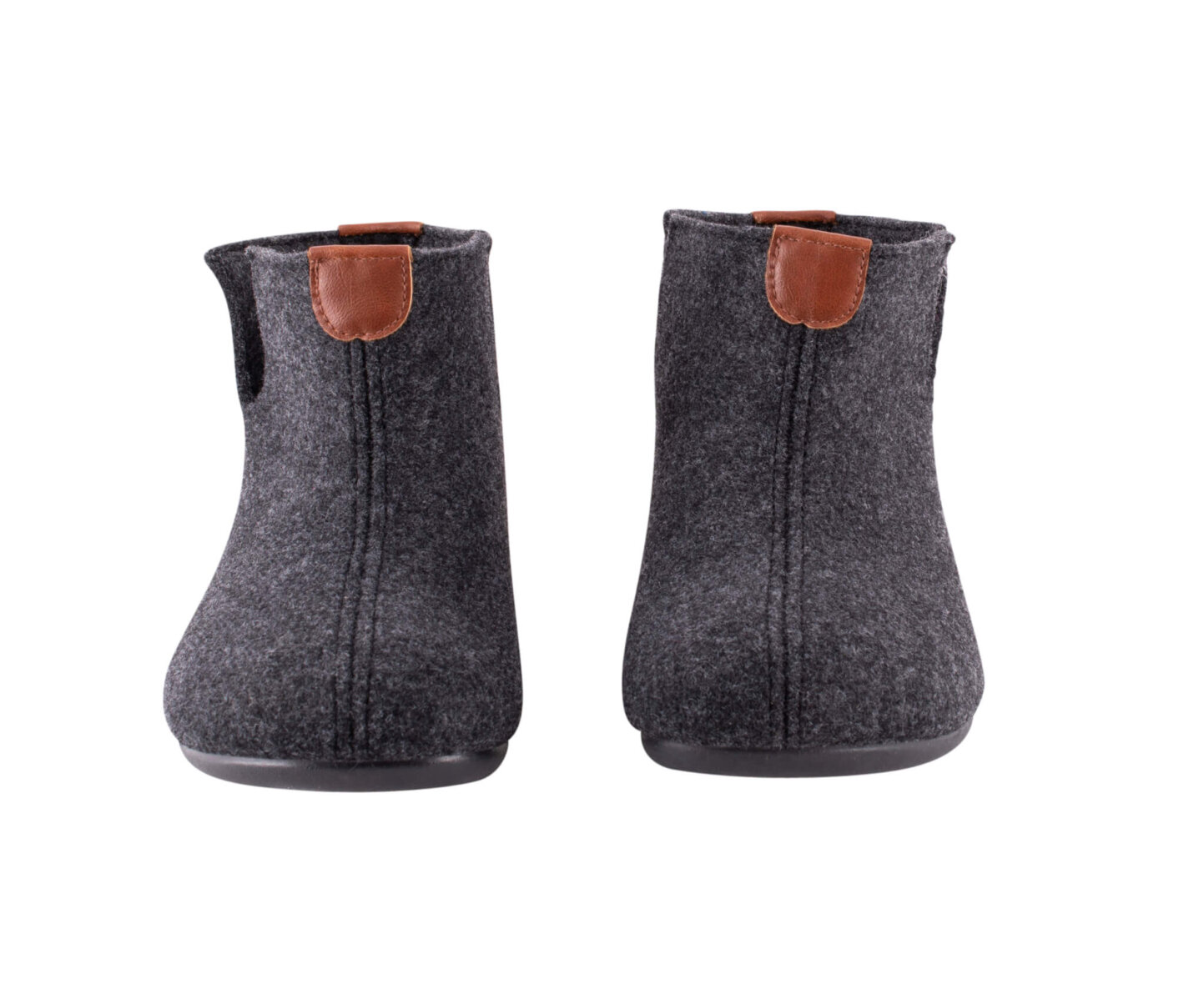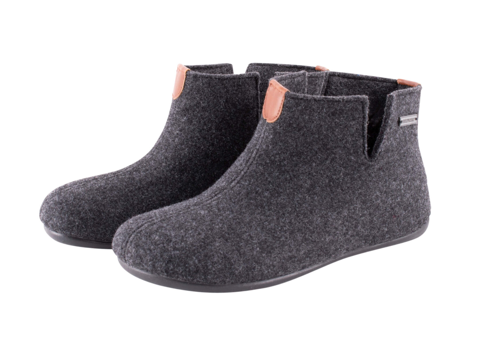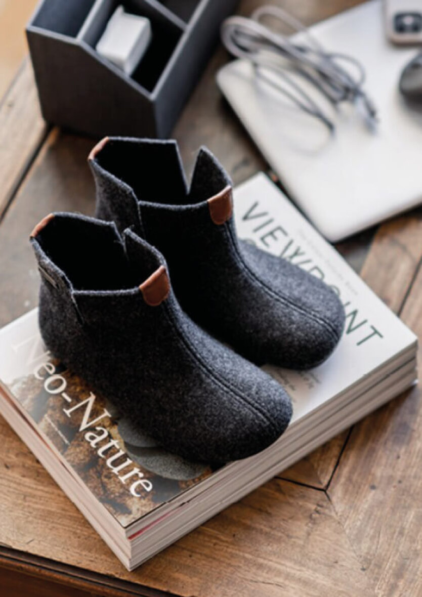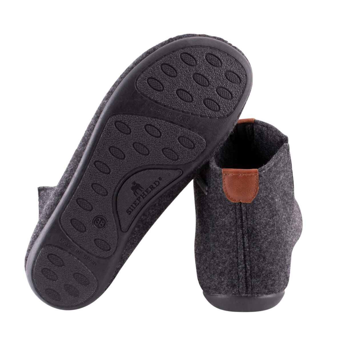 Hjemmeskoen har praktiske slidser i siderne, som gør den let at tage af og på, samt en blød uldindersål, der giver varme og komfort hele dagen.