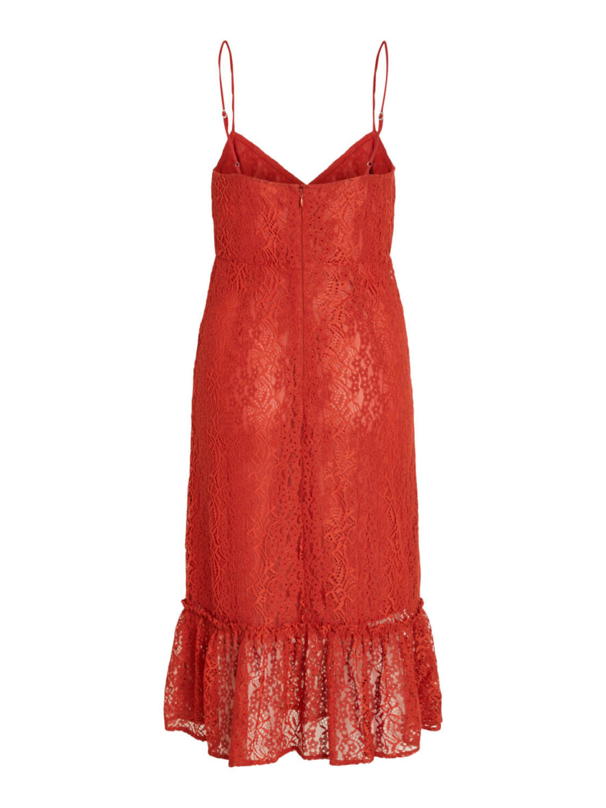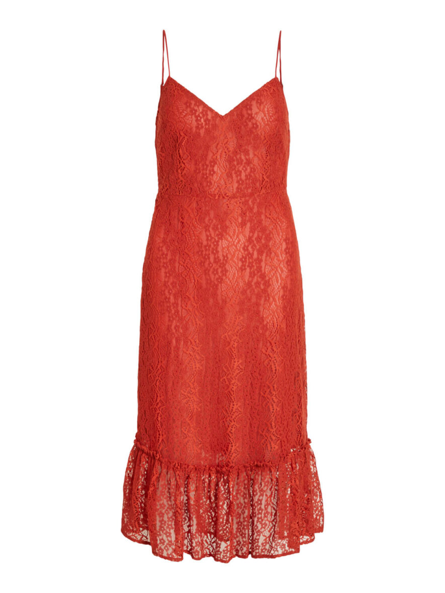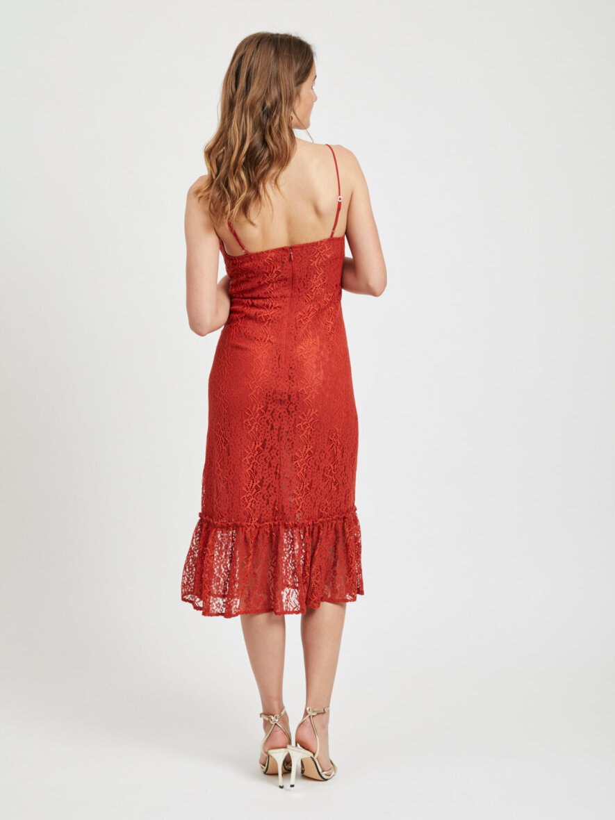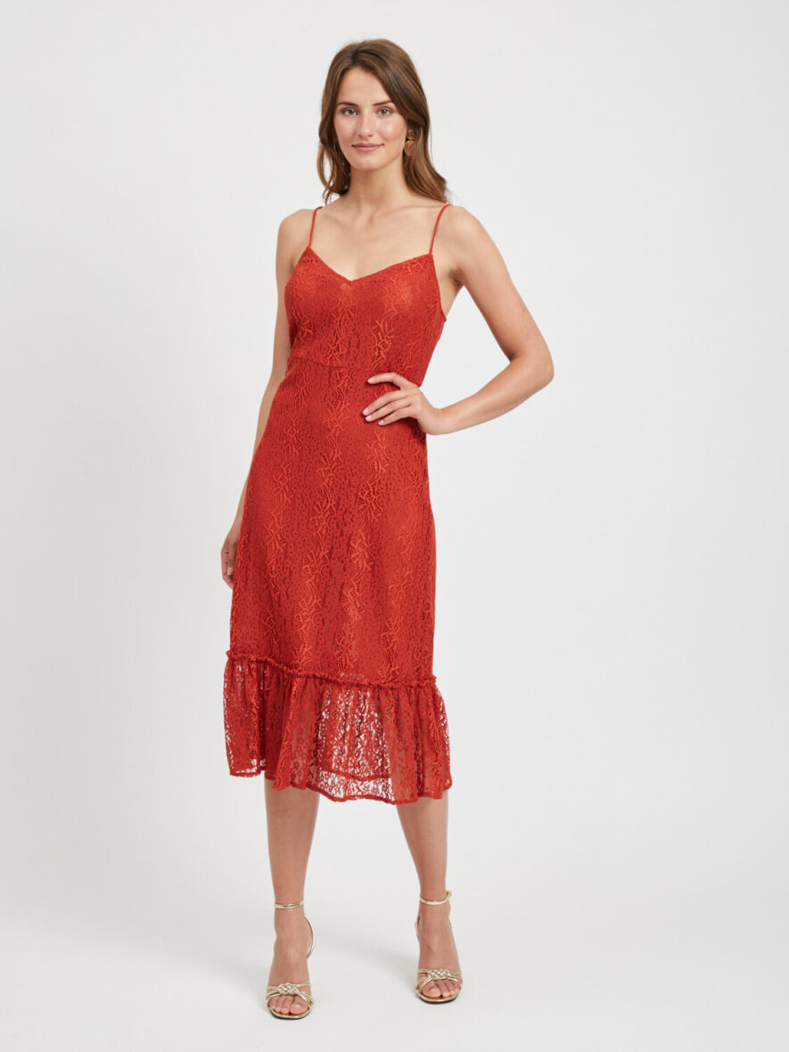 Elegant kjole i rød rustfarve fra VILA med tynde stropper. Fine blonder og med flæser forneden.
