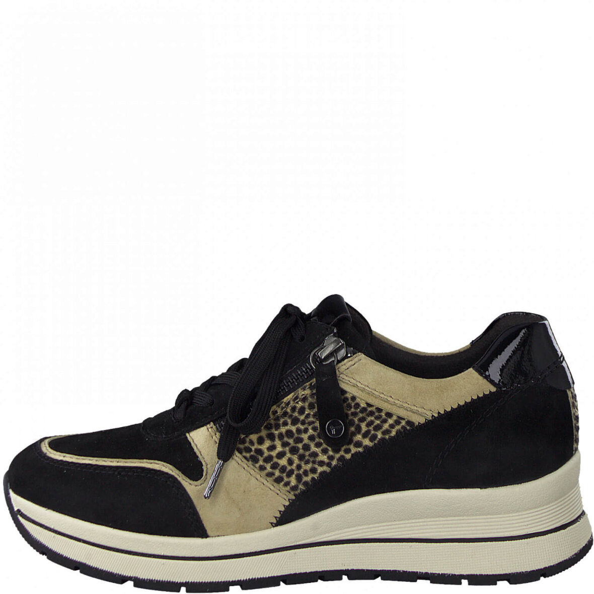 Vildt flotte sneakers med flotte detaljer fra Tamaris. Skoen har lynlås i siden så den er nem at få af og på samt snørebånd langs vristen. Skoen er lavet i en kombination af skind, tekstil og syntetisk udenpå. Indeni er skoen lavet med comfort-linning i tekstil og en udtagelig dæksål i skind. Skoen har en hælhøjde på 40 mm. En smart sko som kan bruges til både hverdag og festlige begivenheder.