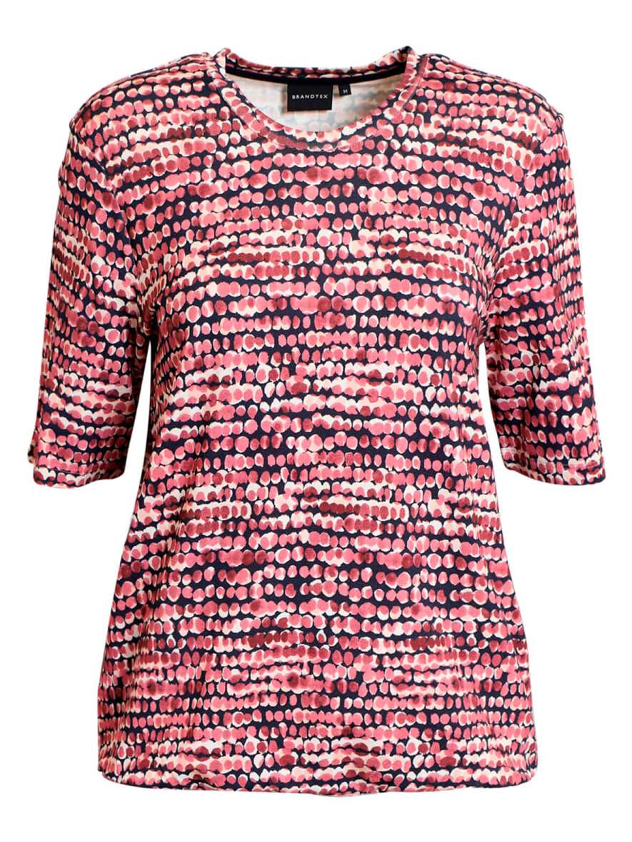 Superfin og sød bluse med print fra Brandtex. Blusen har korte ærmer, elastikkant forneden og rund hals. Max 5% krymp.