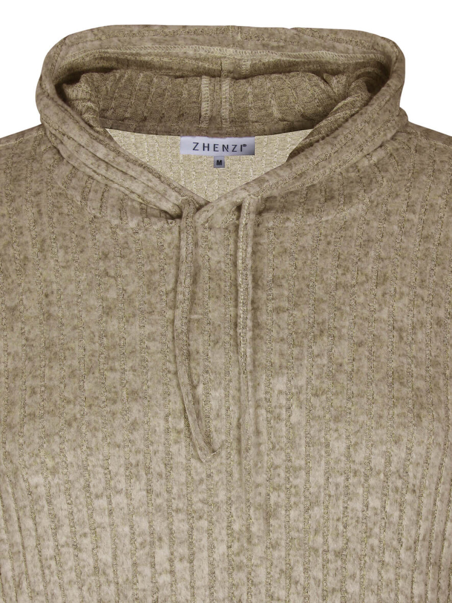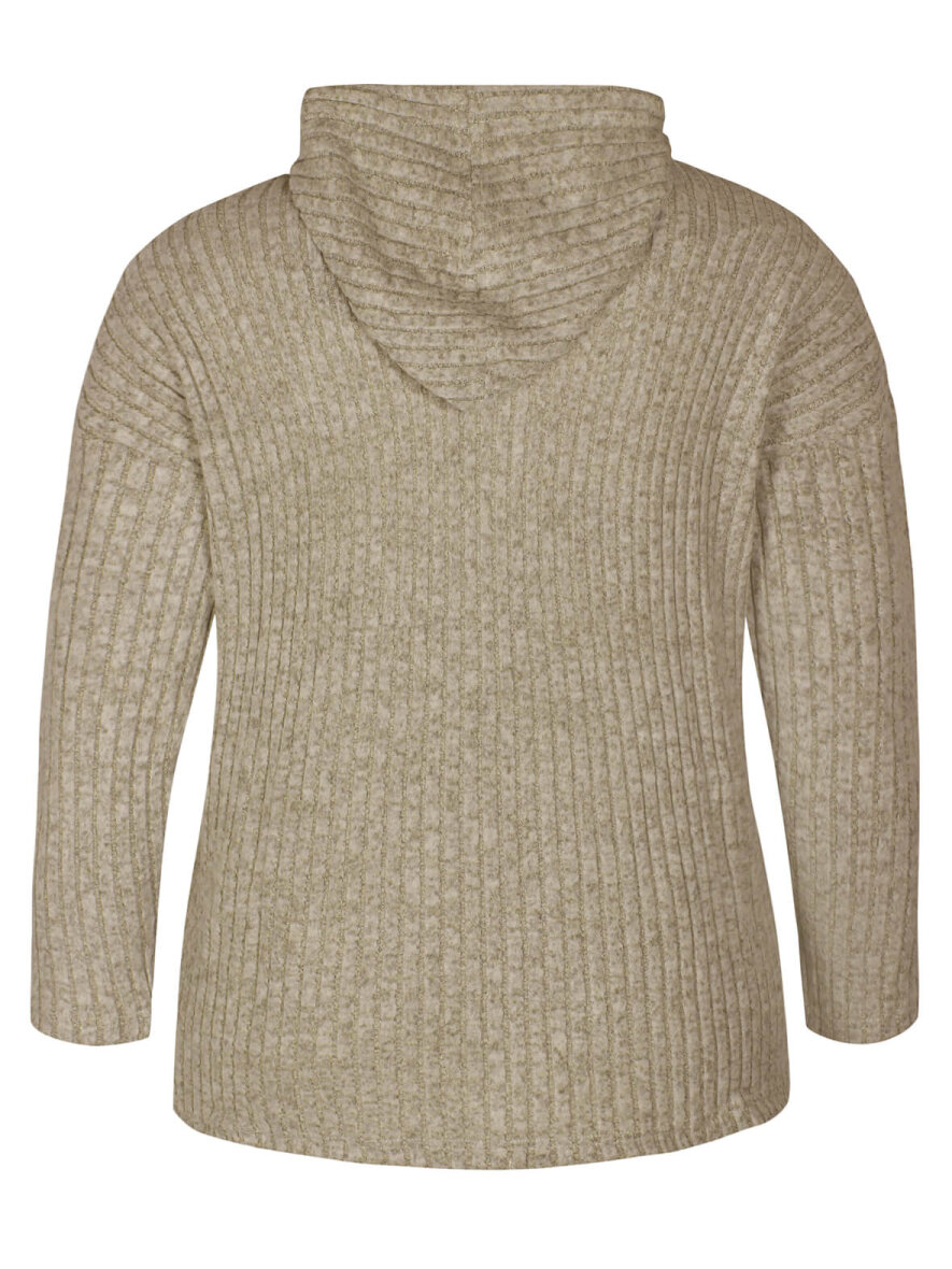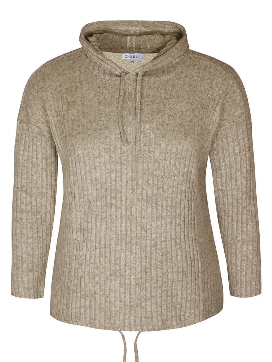 Skøn sandfarvet bluse fra Zhenzi - ultra fleksibel og blød ribkvalitet. Blusen har hætte med snøre og lange ærmer. Nederst på blusen er der løbegang med bindebånd. Max 3% krymp.